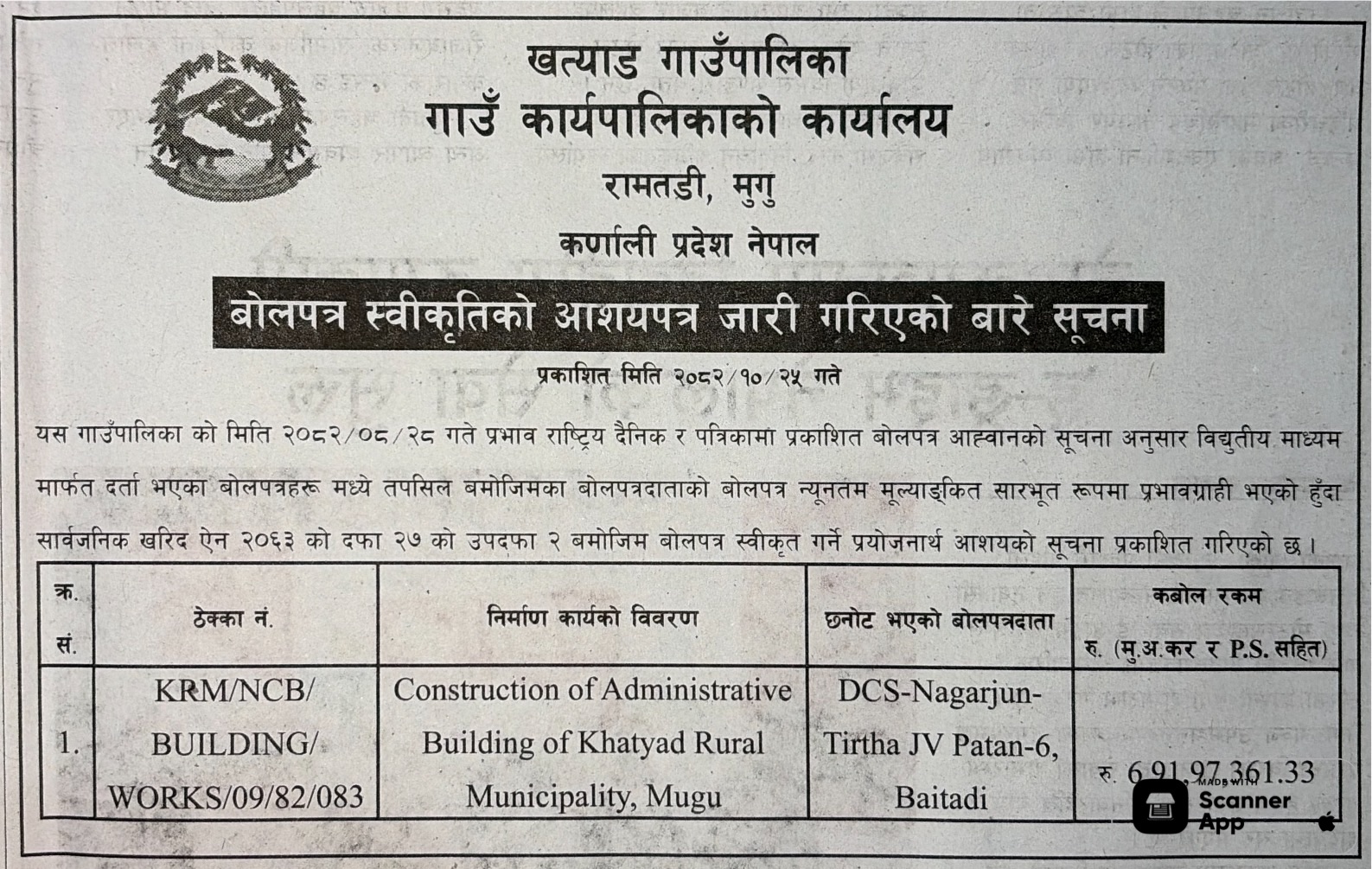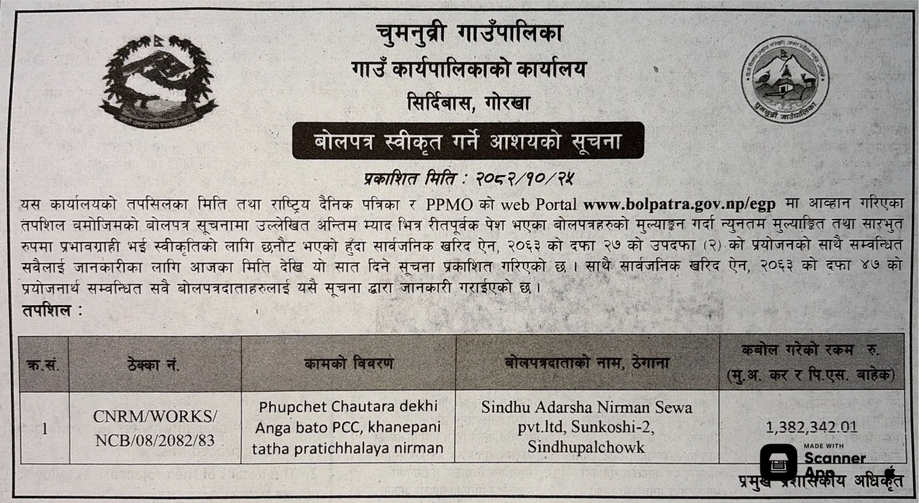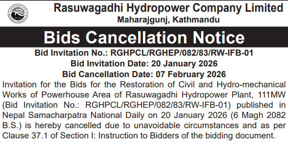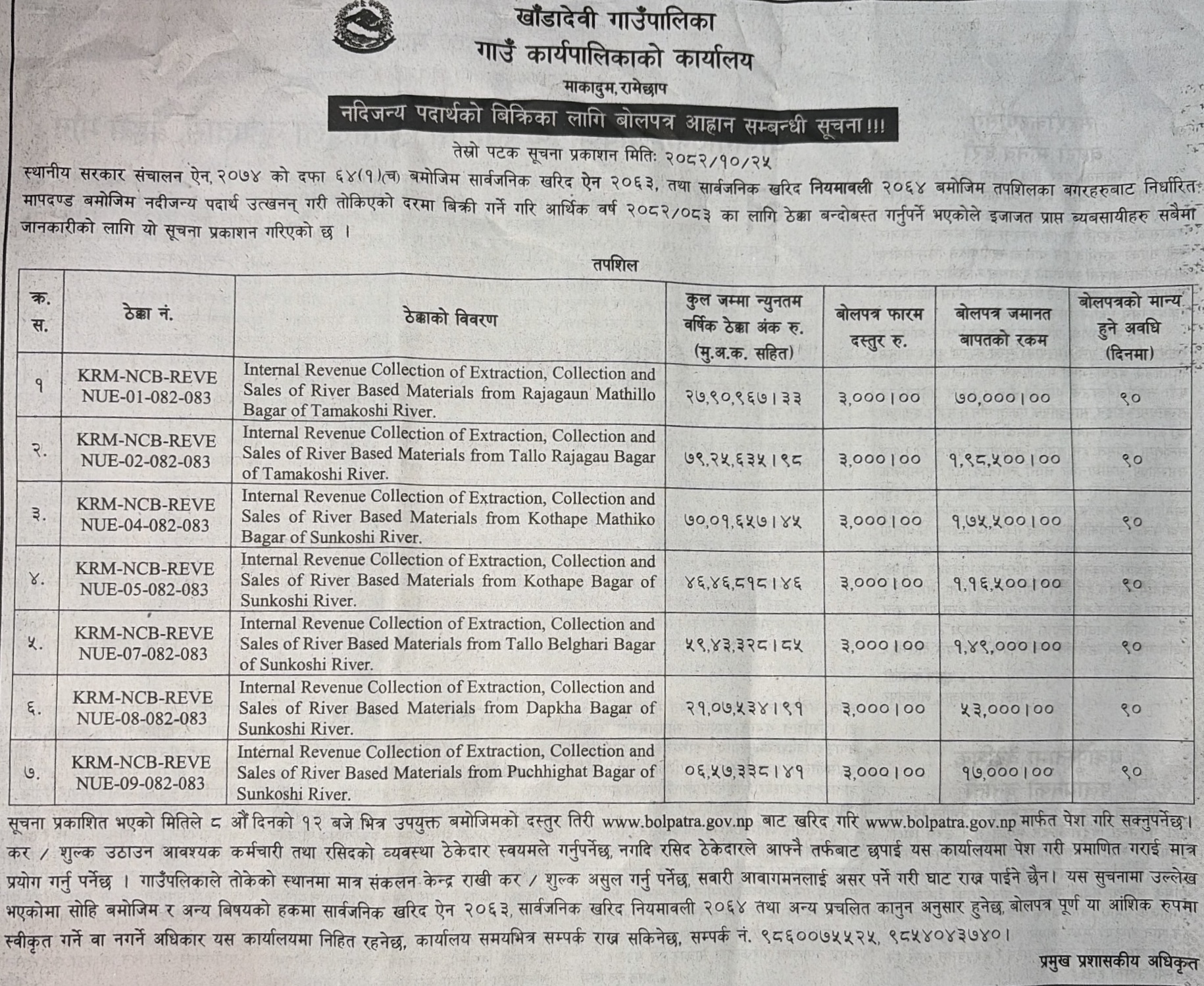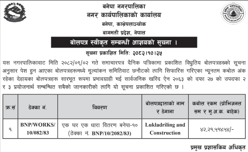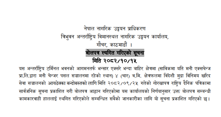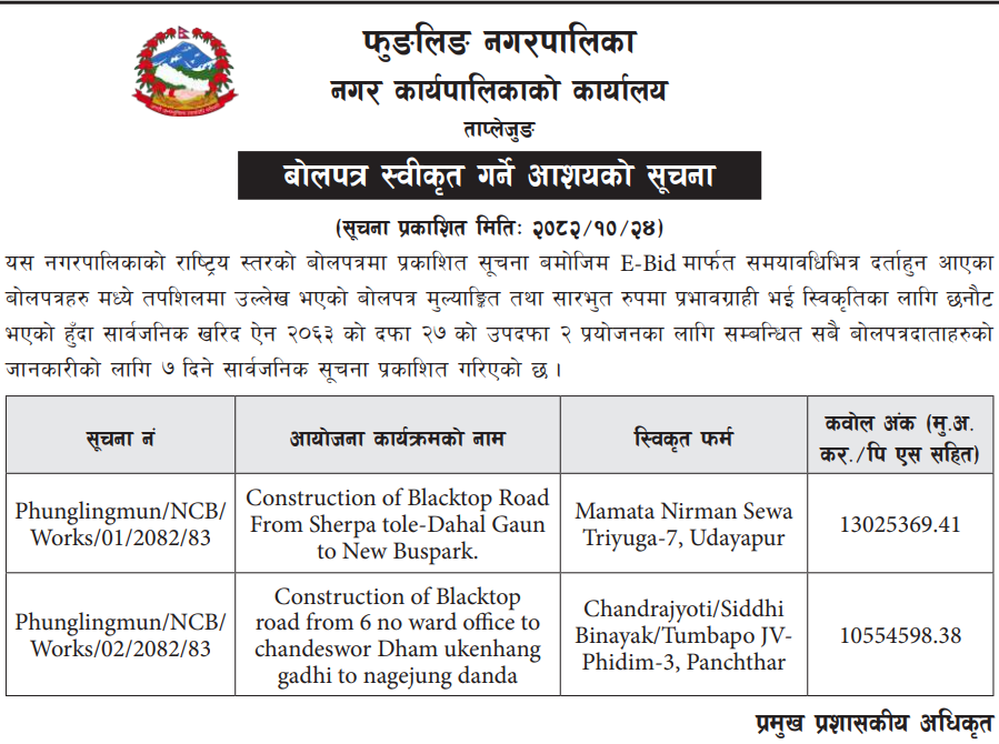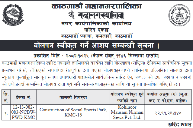 | 187 | Pokhara Metropolitian City Office, Gandaki Province, KASKI; | Construction of Jestha Nagarik Multipurpose Covered Hall, PMC - 19 (Contract ID: 79/PMC/NCB/W/Sharibikash/082-83) | 06/02/2026 | PPMO | 09/03/2026 | Click Here | |