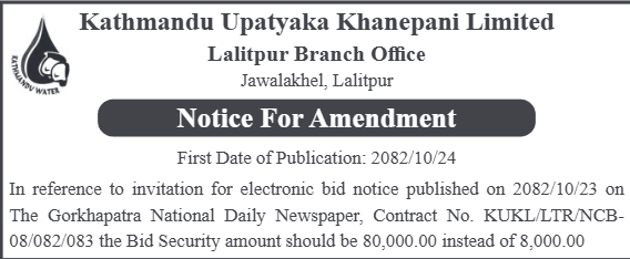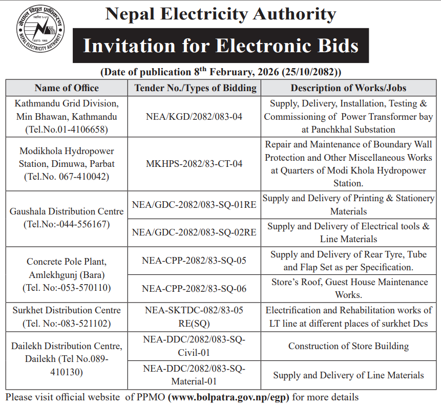| 27 | Kathmandu Upatyaka Khanepani Limited, Tripureshwor Branch | Supply, Laying and Installation of 150 mm DI Pipeline Extension work from Sipradi to Nagarjun-10 | 06/02/2026 | PPMO | 08/03/2026 | Click Here | |