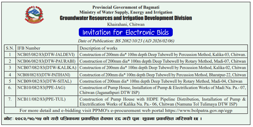 | 225 | Groundwater Resources and Irrigation Development Division, Chitwan | Construction of 200 mm. dia × 100 m depth Deep Tubewell By Rotary Method,Madi-04,chitwan | 06/02/2026 | PPMO | 09/03/2026 | Click Here | |