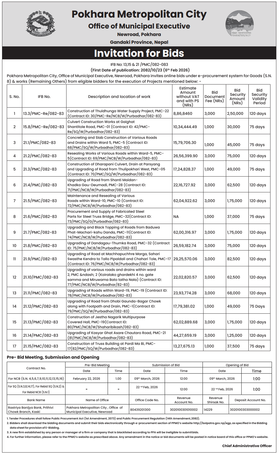 | 186 | Pokhara Metropolitian City Office, Gandaki Province, KASKI; | Upgrading of Roads within Ward-19, PMC-19 (Contract ID:78/PMC/NCB/W/Purbadhar/082-83) | 06/02/2026 | PPMO | 09/03/2026 | Click Here | |