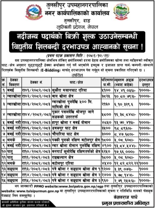 | 35 | Tulsipur Sub-Metropolitan City | Belganar dekhi beljhundi Nawalpur jodne sadak ko kalimati sotama pul nirman ward no 11 | 06/02/2026 | PPMO | 08/03/2026 | Click Here | |