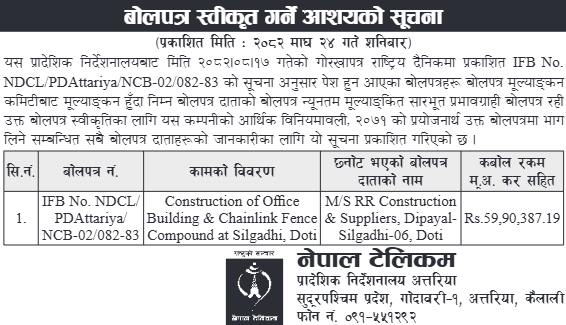 | 1 | Project Office of Urban Development and Building Construction, Jumla | Construction of School Building at Mahadev Ma Vi Gothipigi Singa Rural Municipality, Jumla | 06/02/2026 | PPMO | 09/03/2026 | Click Here | |