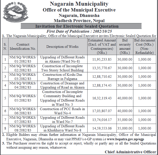 | 31 | Malangawa Municipality Office, Madhesh Province, SARLAHI; | Road upgrading work from the postal highway to the north, east of Krishna Devi Secondary School, Sarlahi Malangwa Municipality, Ward No. 9,Sarlahi District | 06/02/2026 | PPMO | 08/03/2026 | Click Here | |