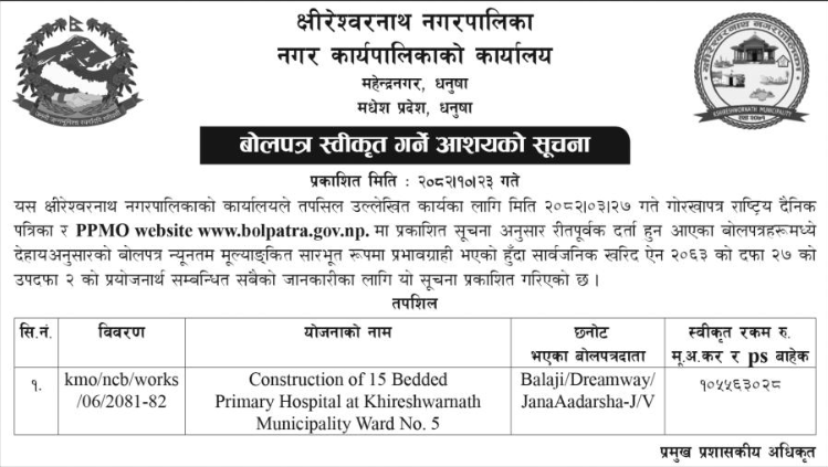 | 142 | Hanumannagar Kankalini Municipality | “Kuposhan Rahit Nagarpalika (Malnutrition-Free Municipality) Program” | 06/02/2026 | PPMO | 22/02/2026 | Click Here | |