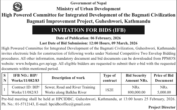 | 206 | High Powered Committee for Integrated Development of The Bagmati Civilization | Reconstruction of Damaged Structure along Bagmati, Bishnumati, Manohara and Nakkhu River due to 2081 flooding. | 06/02/2026 | PPMO | 09/03/2026 | Click Here | |