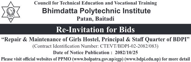 | 203 | Bharatpur Metropolitian City Office, Bagmati Province, CHITWAN; | Construction of Blacktopped Road(Jaya Nepal Dairy Chowk Adhuro Sadak) BMC-15 | 06/02/2026 | PPMO | 09/03/2026 | Click Here | |