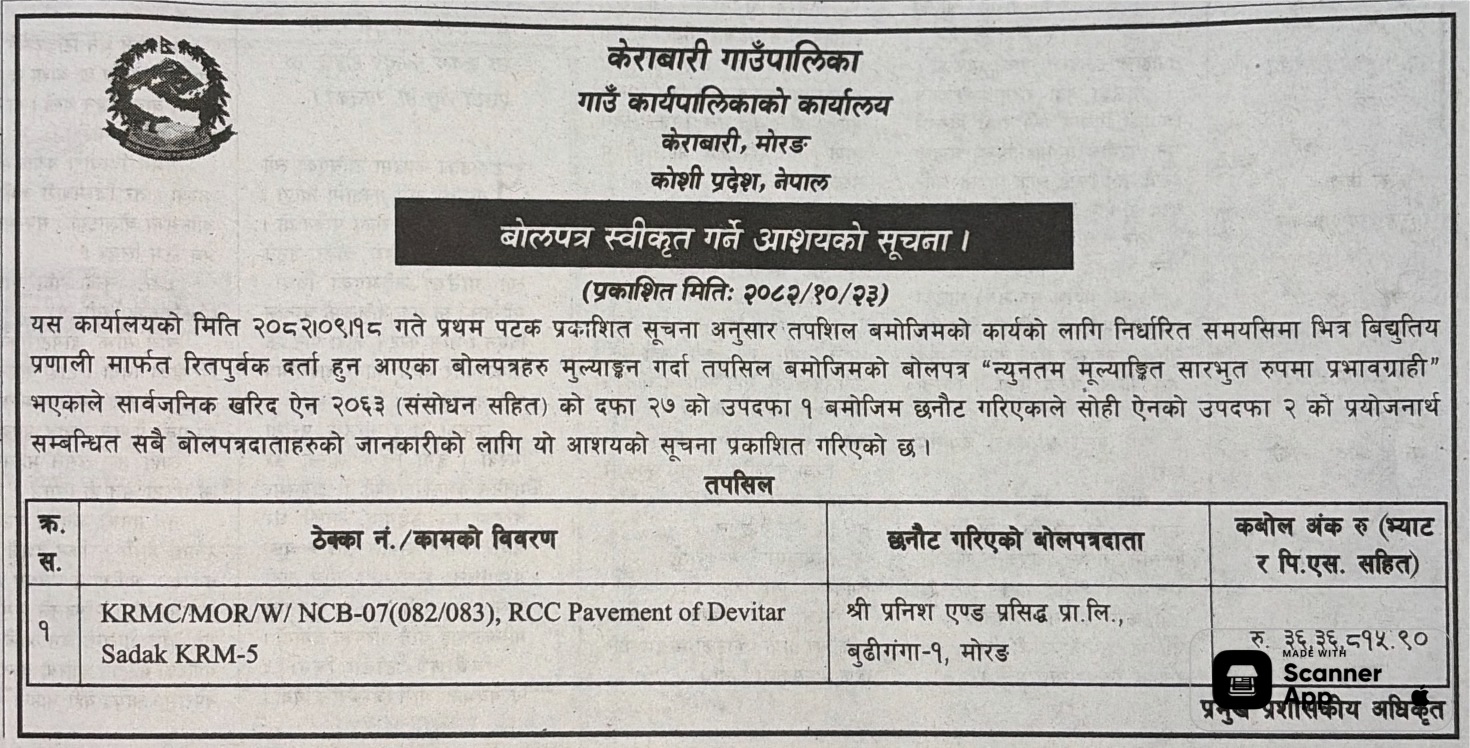 | 23 | Belbari Municipality, Morang | Belbari Nagarpalika building Maintanance | 06/02/2026 | PPMO | 08/03/2026 | Click Here | |