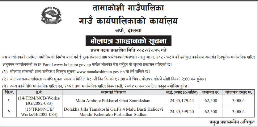 | 10 | Tamakoshi Rural Municipality Office, Bagmati Province, DOLAKHA; | Jalpadevi-Aatamara-Kalidevi Mandir- Deuraligadhi-Hallinedhunga Padmarg. | 06/02/2026 | PPMO | 08/03/2026 | Click Here | |