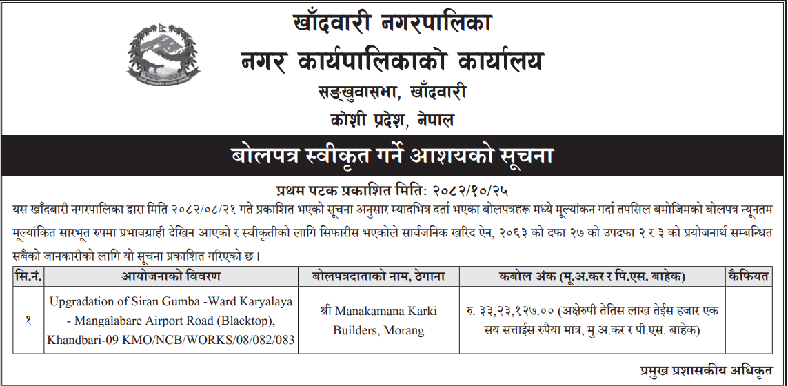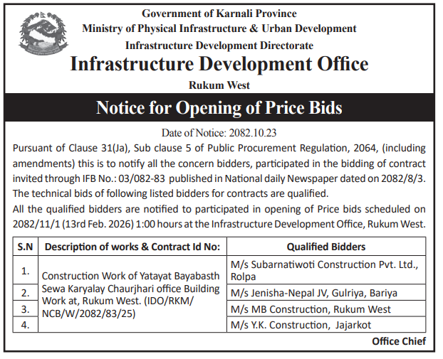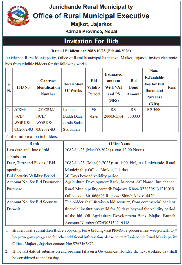 | 215 | Junichande Rural Municipality Office, Karnali Province, JAJARKOT; | LAMITARA BUDDI DADA JUMLA SADAK STARONNATI | 06/02/2026 | PPMO | 09/03/2026 | Click Here | |