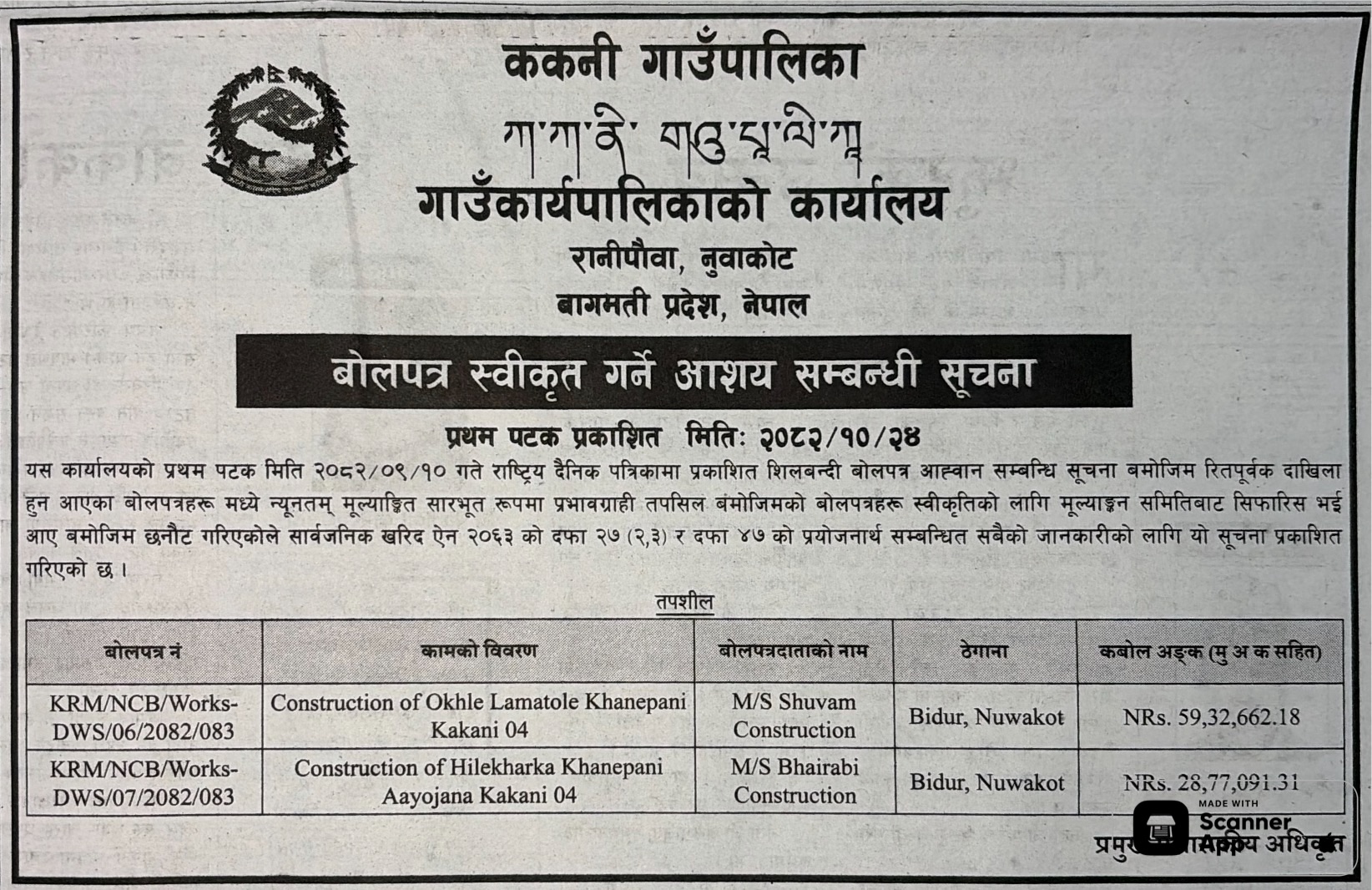 | 33 | Naukunda Rural Municipality, Rasuwa | Construction Of Khalchet Khanepani | 06/02/2026 | PPMO | 08/03/2026 | Click Here | |