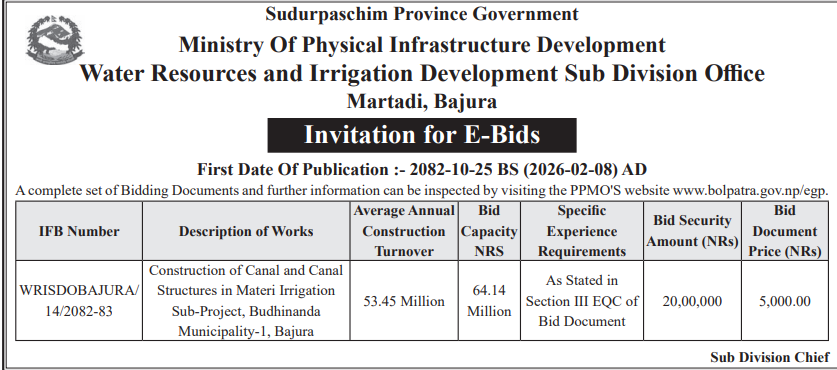 | 216 | Jagannath Rural Municipality Office, Sudurpaschim Province, BAJURA; | Dogade Irrigation Canal Construction Work | 06/02/2026 | PPMO | 09/03/2026 | Click Here | |