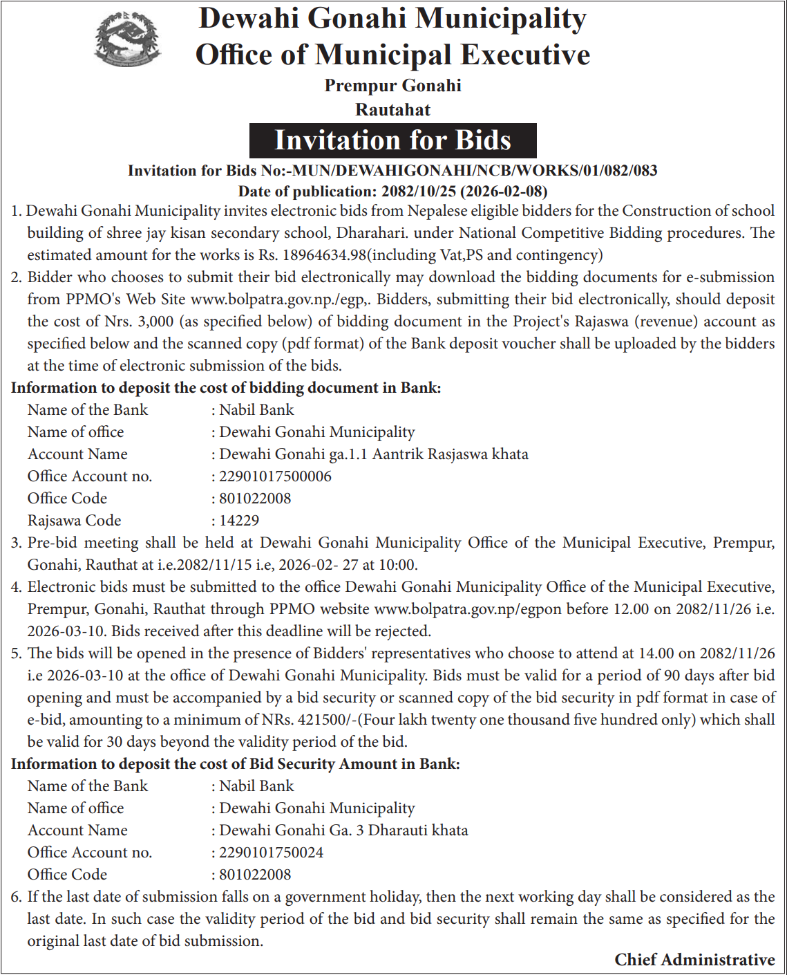 | 26 | Durga Bhagawati Rural Municipality | Construction Work of Shree Sarwasati Ma.Vi. Pipara Bhalohiya School Building at Ward No.-02, Durga Bhagwati Rural Municipality, Rautahat | 06/02/2026 | PPMO | 08/03/2026 | Click Here | |