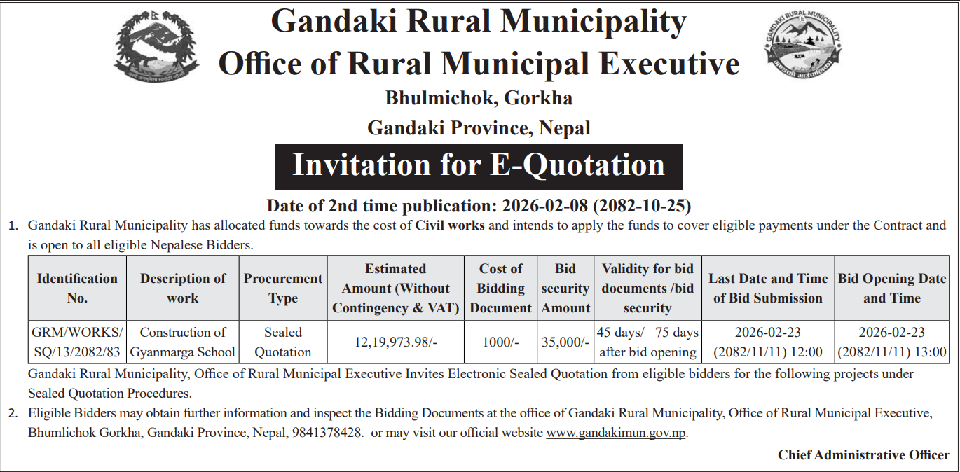 | 19 | Putalibazar Municipality Office, Gandaki Province, SYANGJA; | Bejhang Satau Chandikalika Khanepani aayojana Marmat | 06/02/2026 | PPMO | 08/03/2026 | Click Here | |