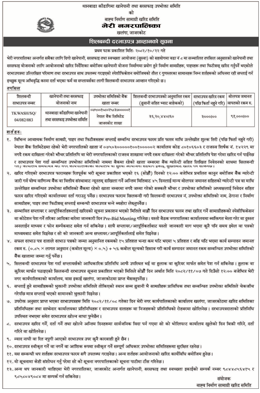 | 235 | Shivalaya Rural Municipality, Jajarkot | Procurement , Supply And Delivery OF Construction Material For Totikhola khatena Aarsina and Umaura tata Road Upgrading Project (LISP Project) Shivalaya-3,4, Jajarkot | 06/02/2026 | PPMO | 12/02/2026 | Click Here | |