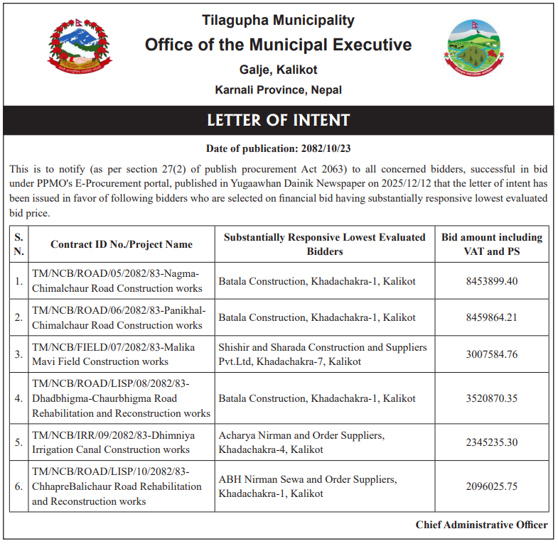 | 147 | Subhakalika Rural Muncipality,Kalikot | Procurement and Supply of goods Kalekhola Rarakatiya dekhi sajha pata samma road maintainance-LISP | 06/02/2026 | PPMO | 22/02/2026 | Click Here | |