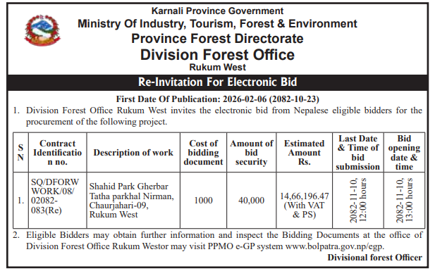 | 20 | Banke National Park, Obhari | Construction of Wildlife Rescue Centre in Banke National Park | 06/02/2026 | PPMO | 08/03/2026 | Click Here | |