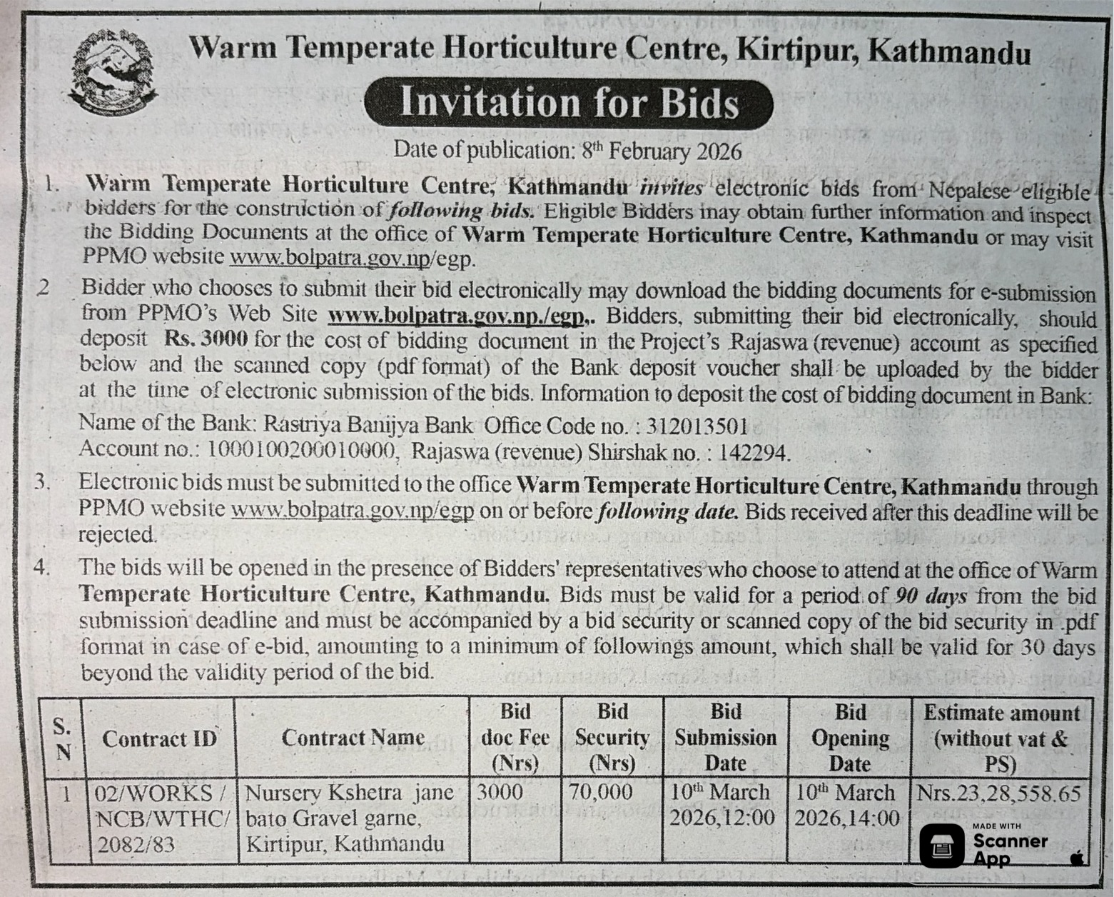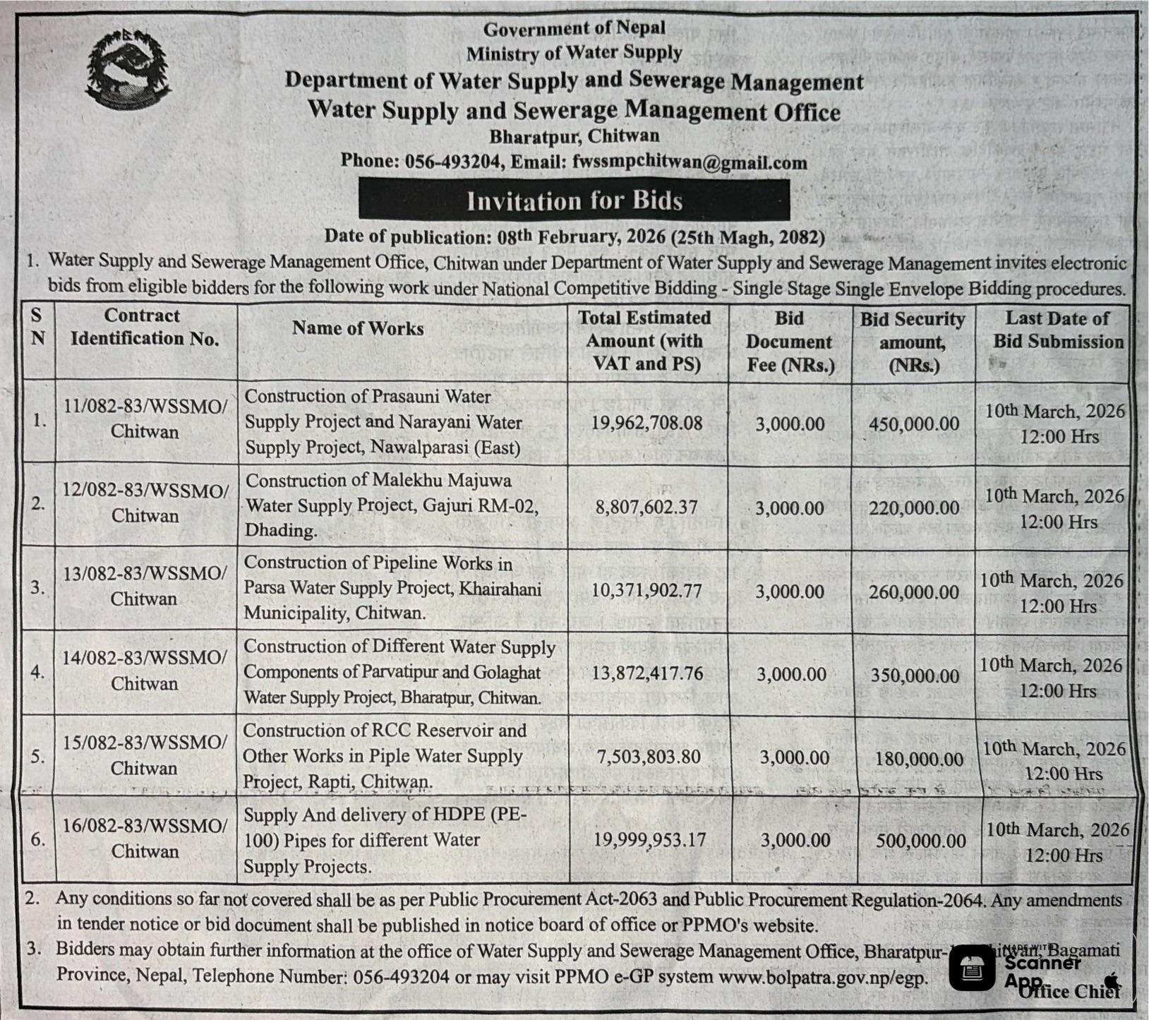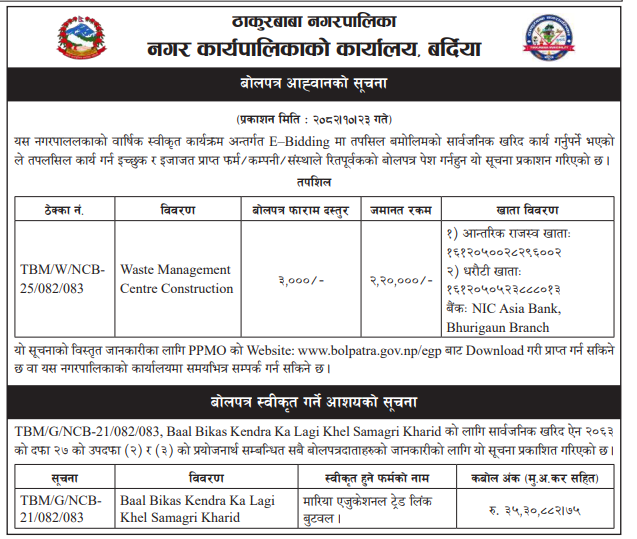 | 8 | Thakurbaba Municipality Office, Lumbini Province, BARDIYA; | Waste Management Centre Construction | 06/02/2026 | PPMO | 09/03/2026 | Click Here | |
