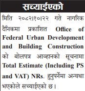 | 208 | Office of Federal Urban Development and Building Construction, Kathmandu | Construction of a building for Autism Special School in Budhanilkantha -06, Kathmandu | 06/02/2026 | PPMO | 09/03/2026 | Click Here | |