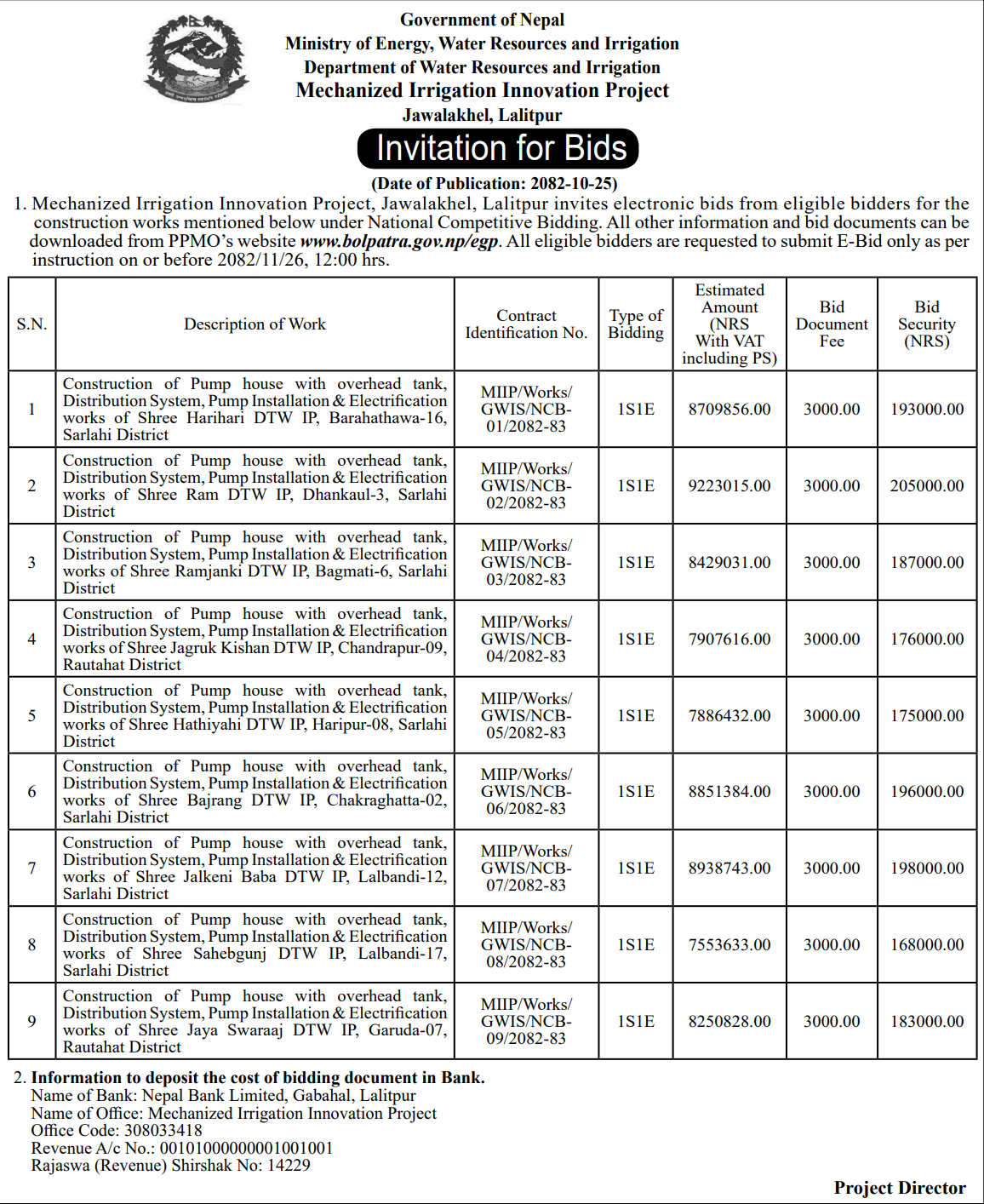 | 213 | Groundwater Irrigation Project, Rupandehi | DTW electrification work and Installation of Transformer and Accessories in Rupandehi and West Nawalparasi. | 06/02/2026 | PPMO | 09/03/2026 | Click Here | |