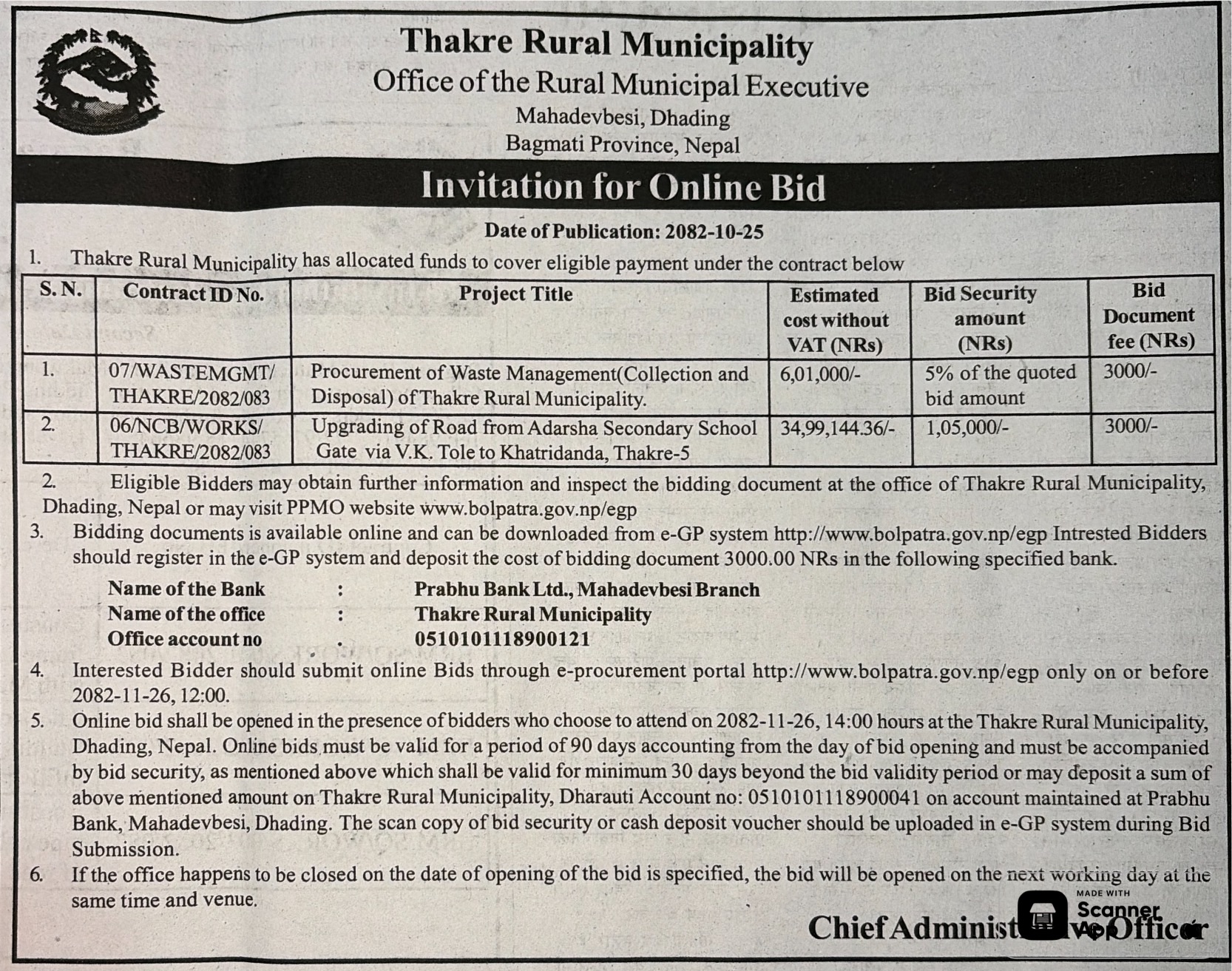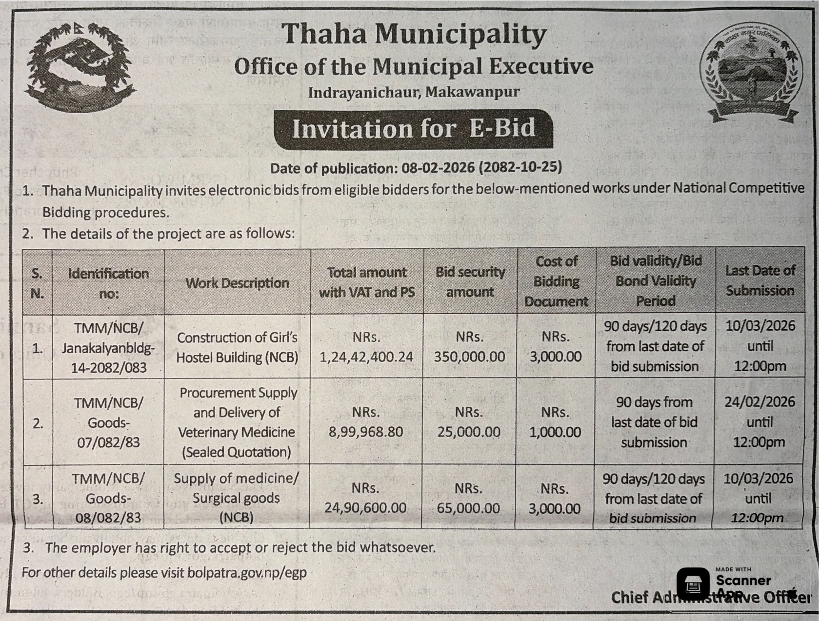 | 141 | Sunwal Municipality Office | Supply and Delivery of Stationary items at Sunwal Municipality | 06/02/2026 | PPMO | 22/02/2026 | Click Here | |