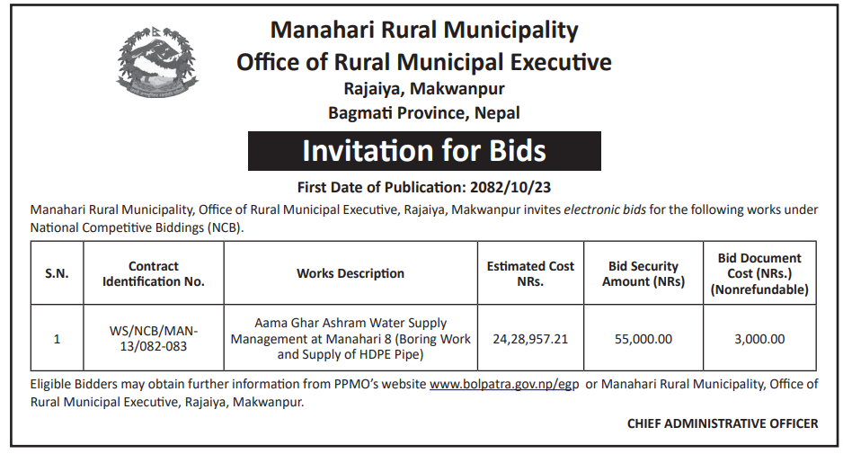 | 9 | Manahari Rural Municipality Office, Bagmati Province, MAKWANPUR; | Aama Ghar Ashram Water Supply Management at Manahari 8 (Boring Work and Supply of HDPE Pipe) | 06/02/2026 | PPMO | 09/03/2026 | Click Here | |