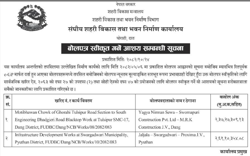 | 180 | Urban Development & Building Office Ghorahi, Dang | Patihalna Kumal Dhara Pipalrukh Deurali Gulmi Urban Development Works Gaumukhi-7,Pyuthan. | 06/02/2026 | PPMO | 10/03/2026 | Click Here | |