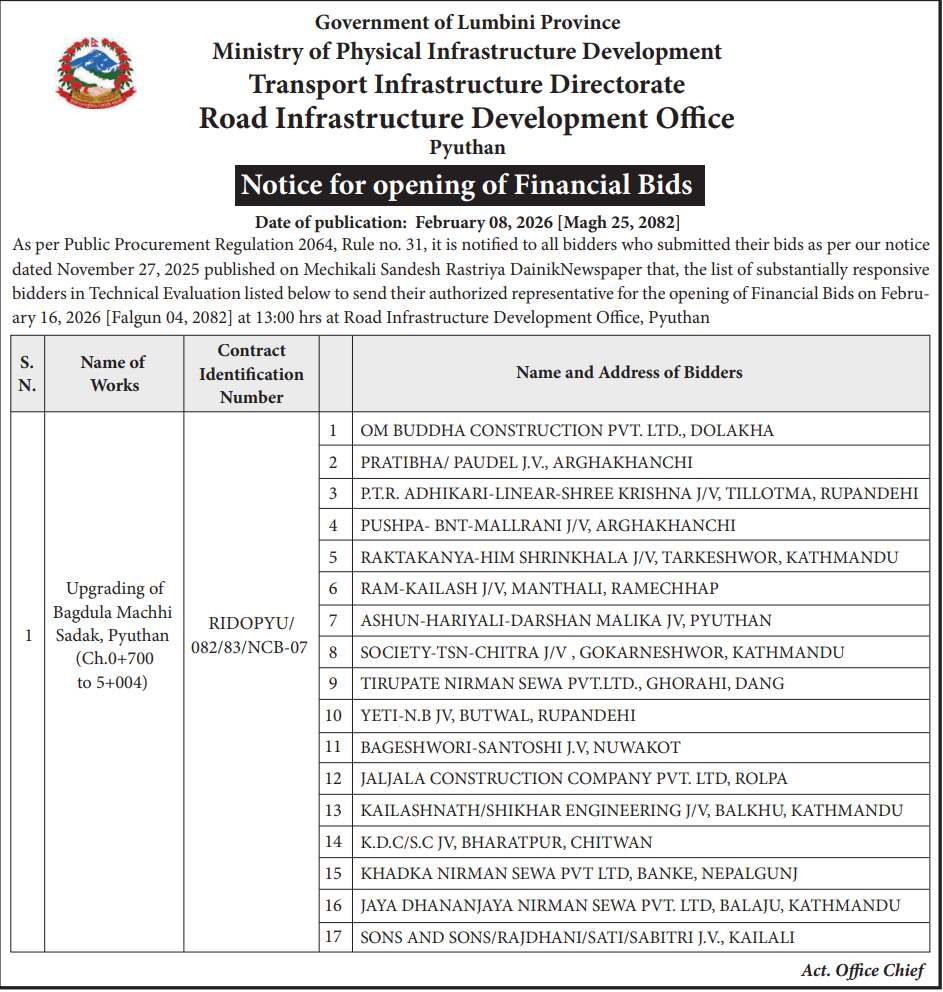 | 38 | Road Infrastructure Development Office, Arghakhanchi | Kharjyang Gulmi Thulakhark Banjhapata Mahapokhari Chauwa Milmile Chidipani Tilkuwakhola Chauri Dundruk Gajyangkhola Chauwa sadak | 06/02/2026 | PPMO | 23/02/2026 | Click Here | |
