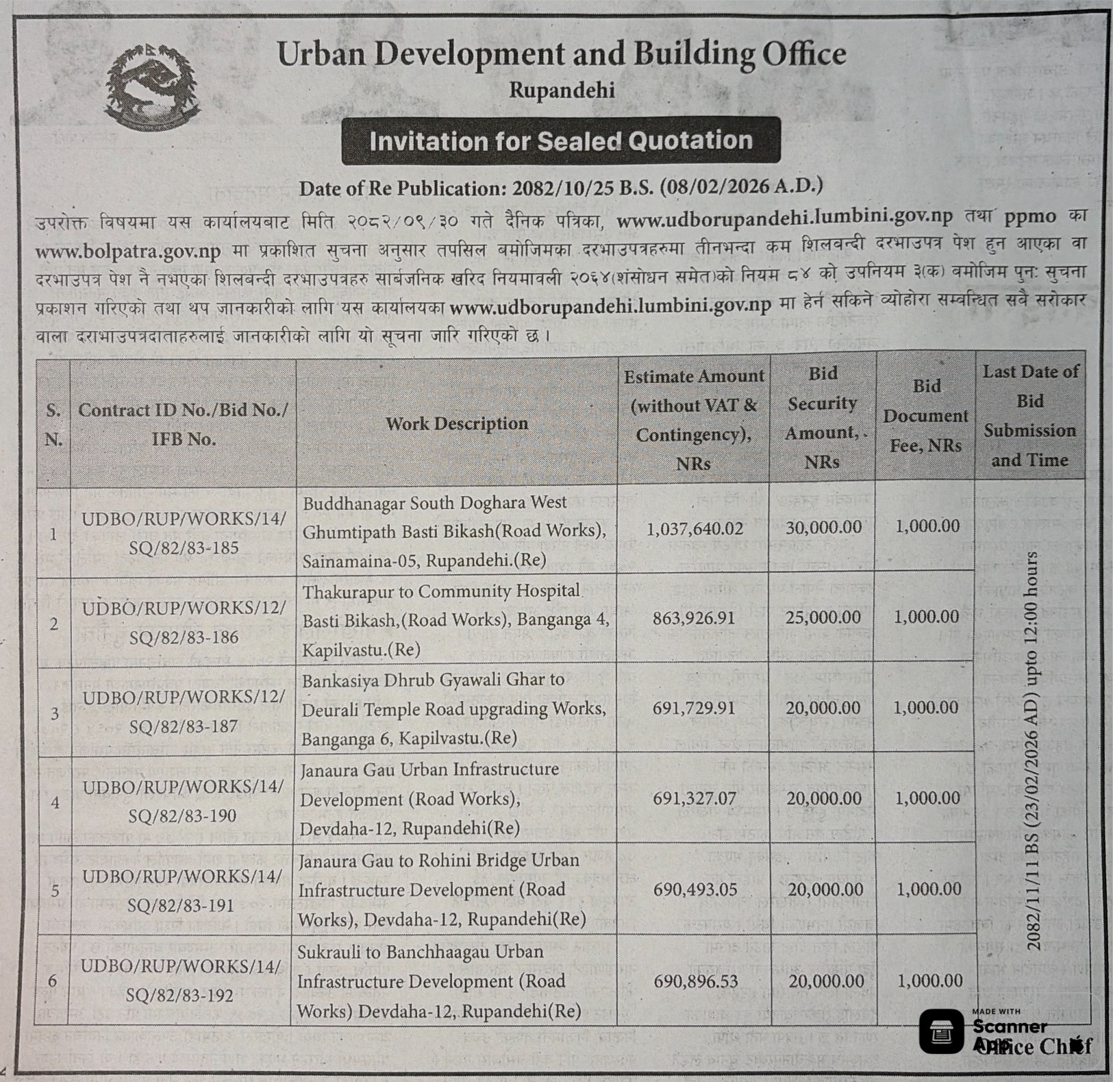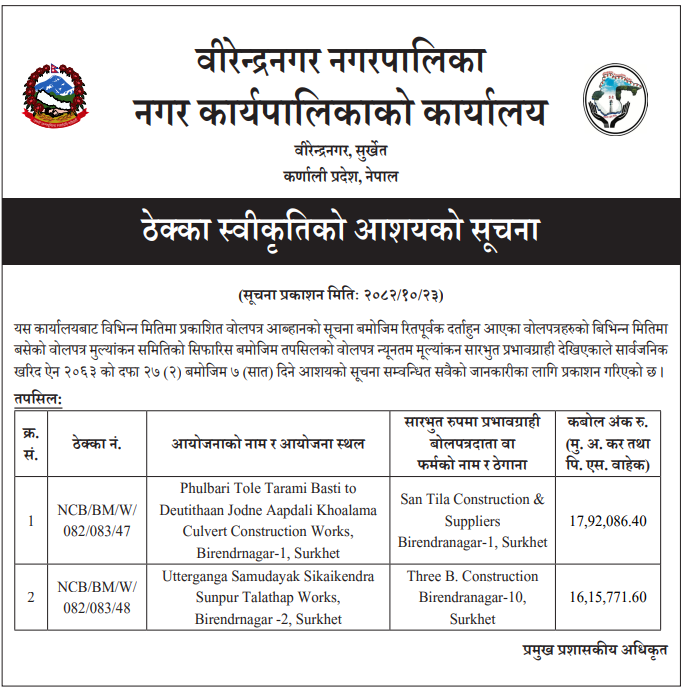 | 202 | Road Infrastructure Development Office, Nawalparasi ( Bardhaghat susta west) | Upgrading of i)Rasahili chauk Bradaghat -16 dekhi wada no. 14 ko Shiris dada samma Road, Bardaghat-16,14, ii) Shivalaya Mandir hudai Rastriya ma.vi. jane Road, Bardaghat-5 , Nawalparasi , RIDONAW/134/NCB/082-83/35 | 06/02/2026 | PPMO | 09/03/2026 | Click Here | |