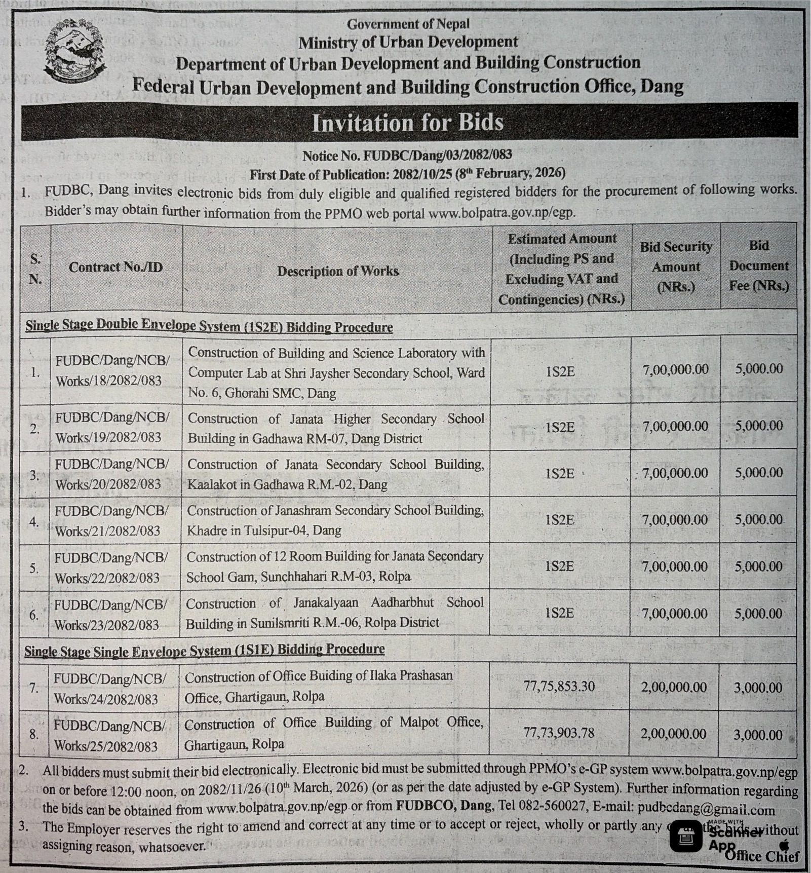 | 15 | Project Office of Urban Development and Building Construction, PARSA | Construction of School Building at Durga Namuna Madhyamik and Siddheswor Sanskrit Madhyamik School in Kalaiya | 06/02/2026 | PPMO | 08/03/2026 | Click Here | |