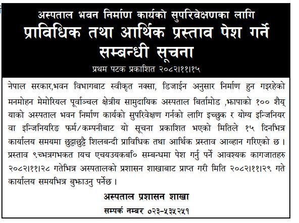| 37 | District Hospital Dhankuta | Procurement Of Miscellaneous Items Of Medicines | 03/03/2026 | PPMO | 18/03/2026 | Click Here | |