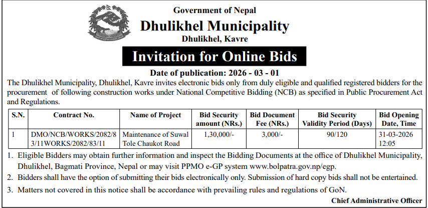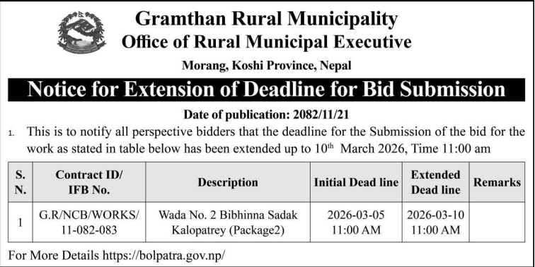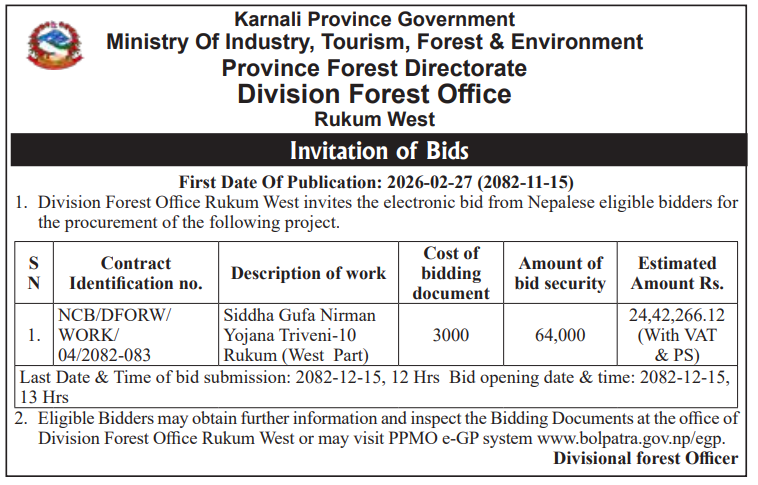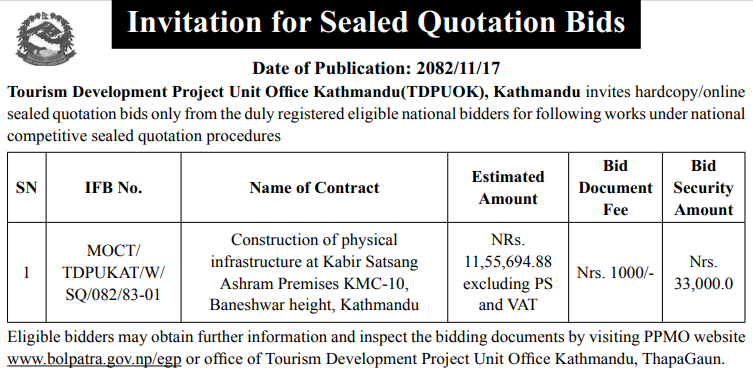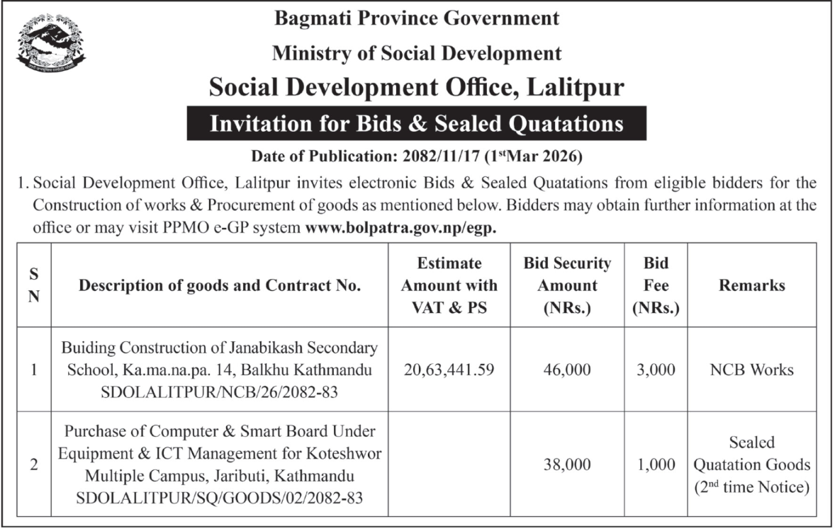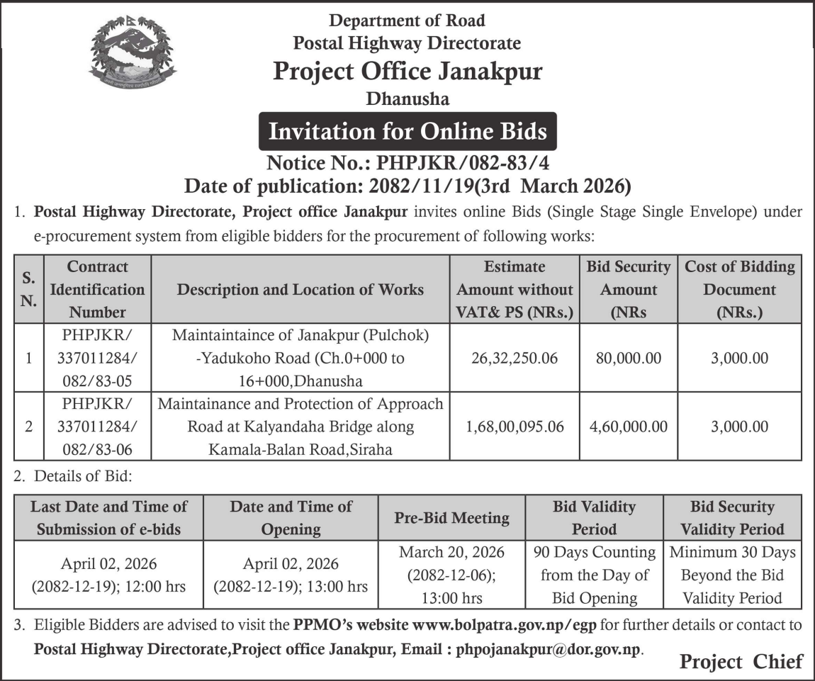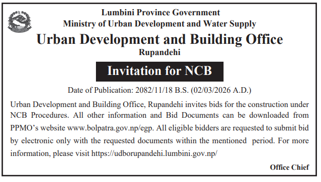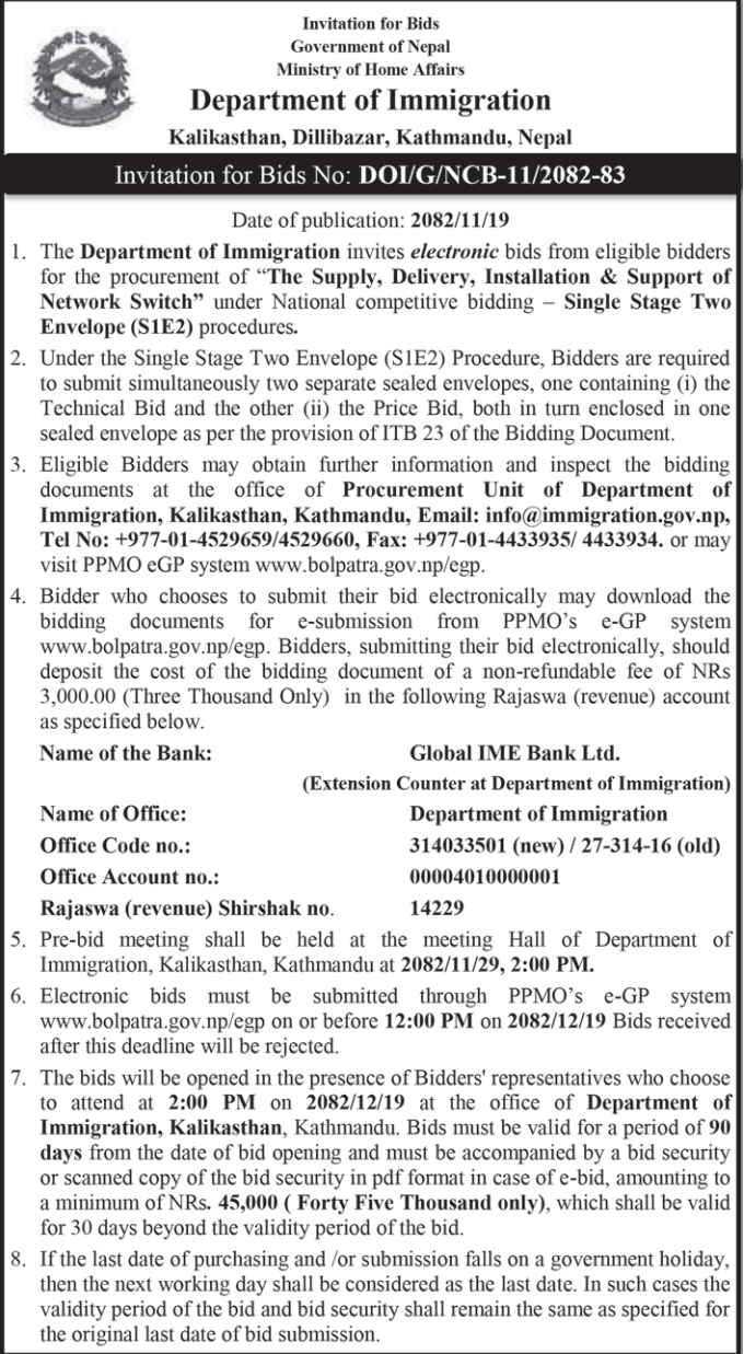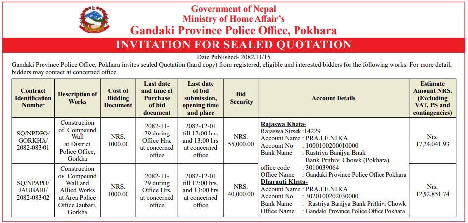 | 25 | Nepal Police Headquarter Procurememt Section, Naxal | Expansion of Nepal Police Computer Network Sites | 03/03/2026 | PPMO | 02/04/2026 | Click Here | |