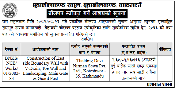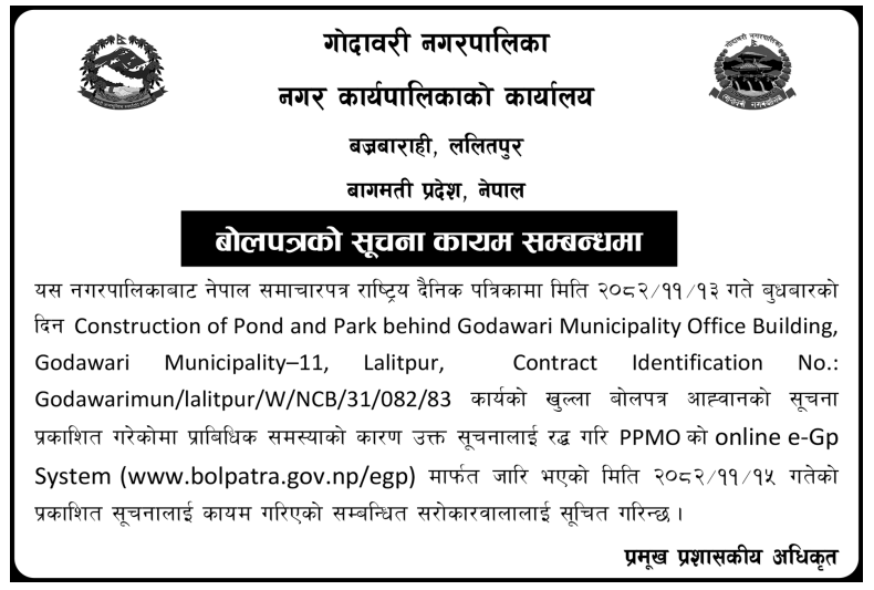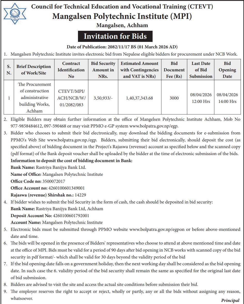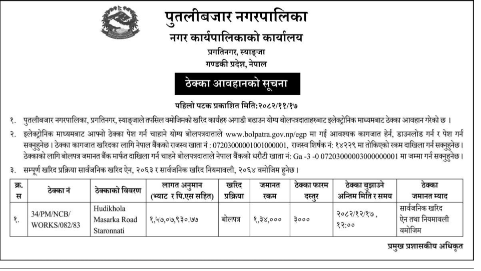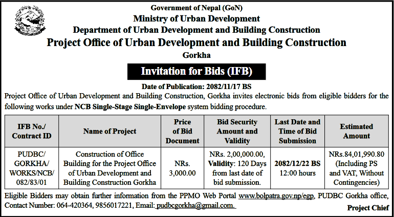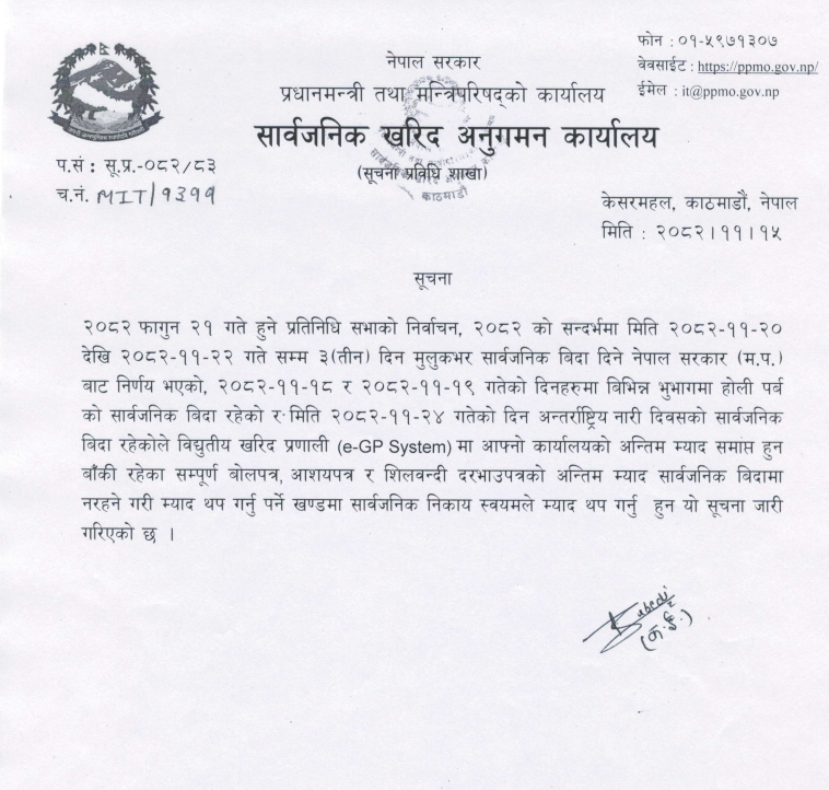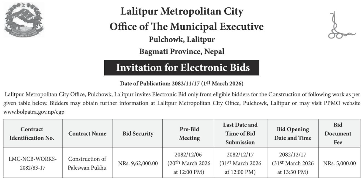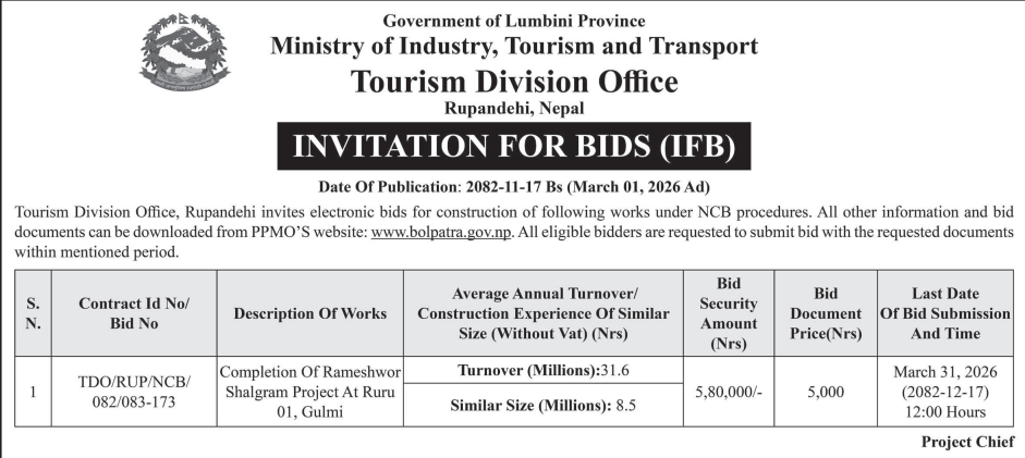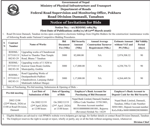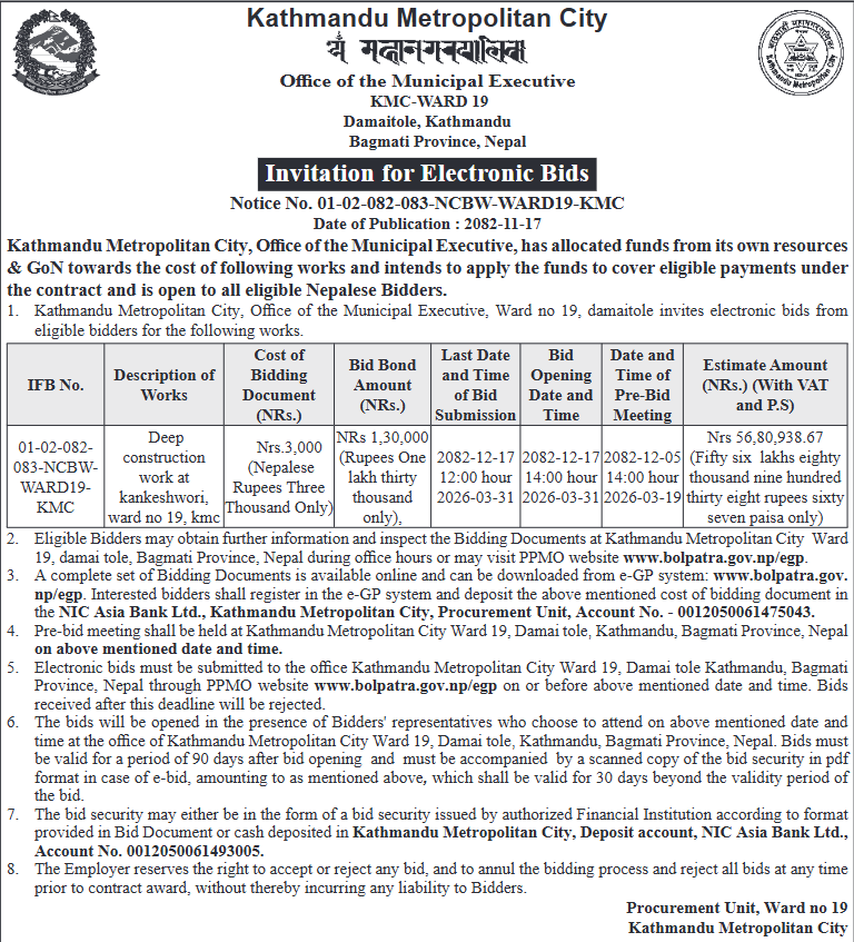 | 25 | Nepal Police Headquarter Procurememt Section, Naxal | Expansion of Nepal Police Computer Network Sites | 03/03/2026 | PPMO | 02/04/2026 | Click Here | |