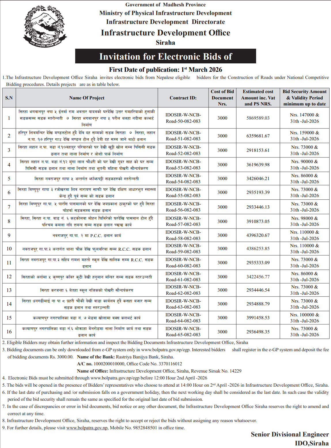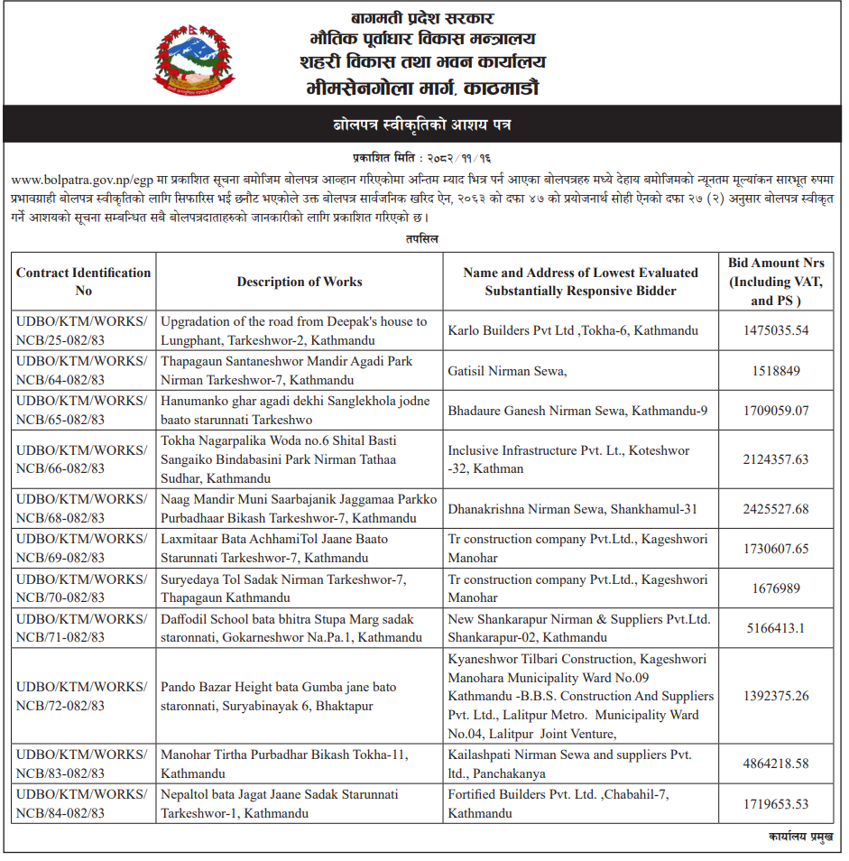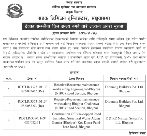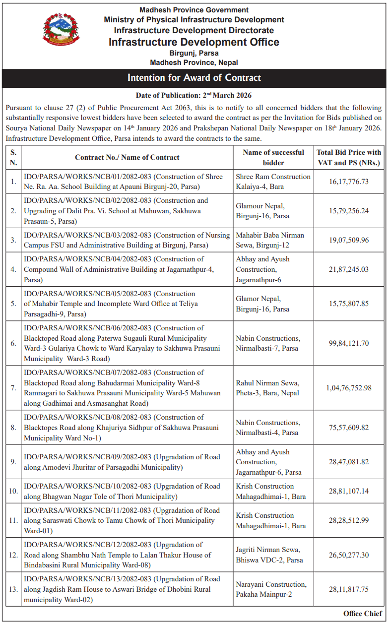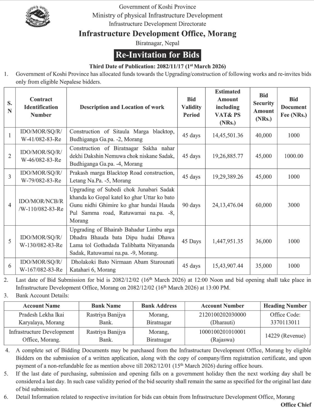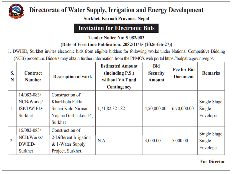 निर्माण सम्बन्धी प्रकाशित सम्पूर्ण ठेक्का टेन्डर तथा बोलपत्र सुचनाहरु प्रदेश अनुसार 08/03/2026 (Sunday)