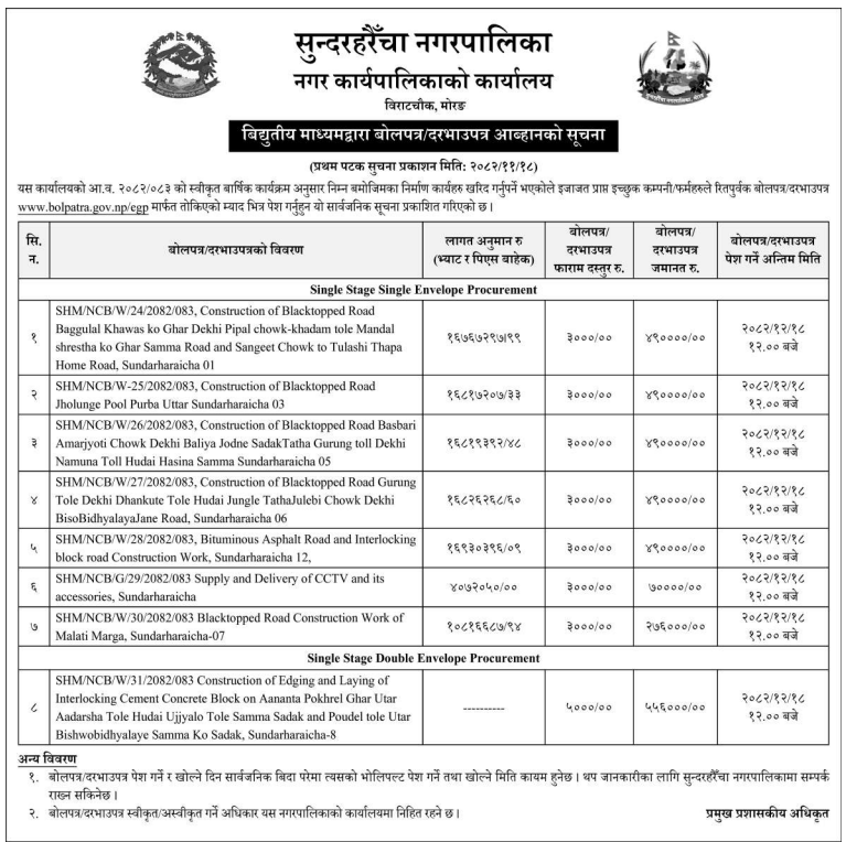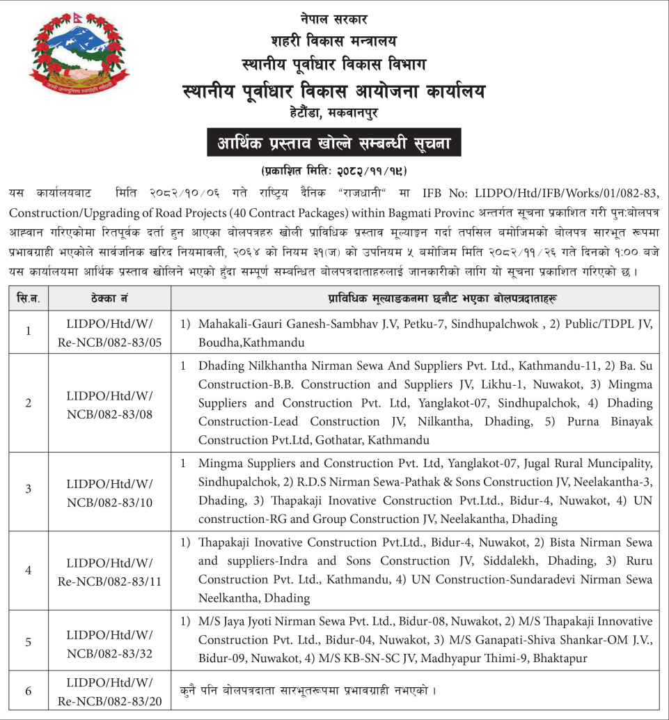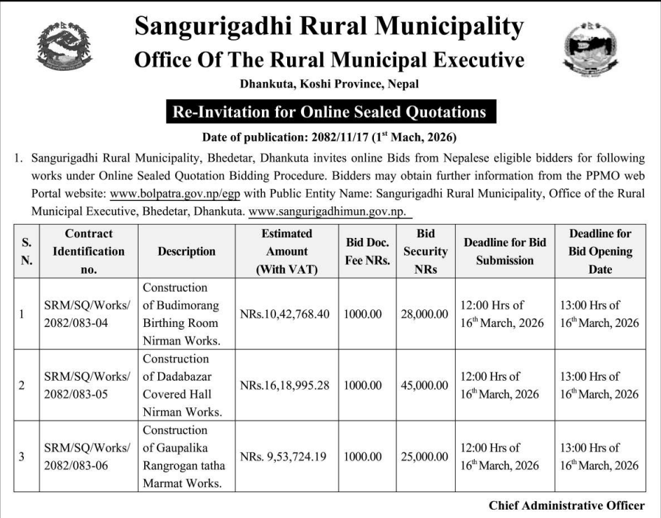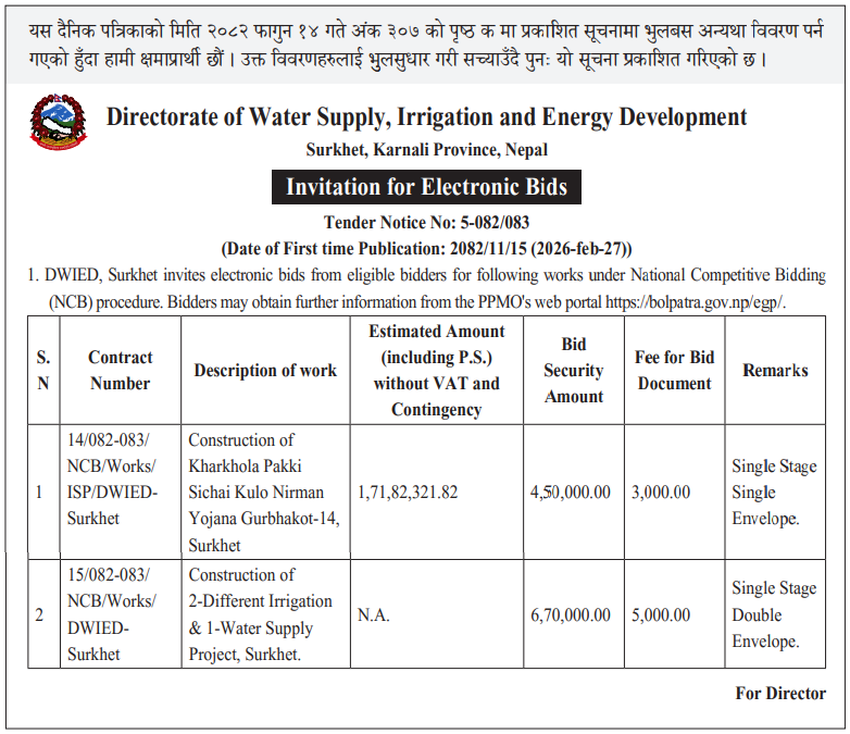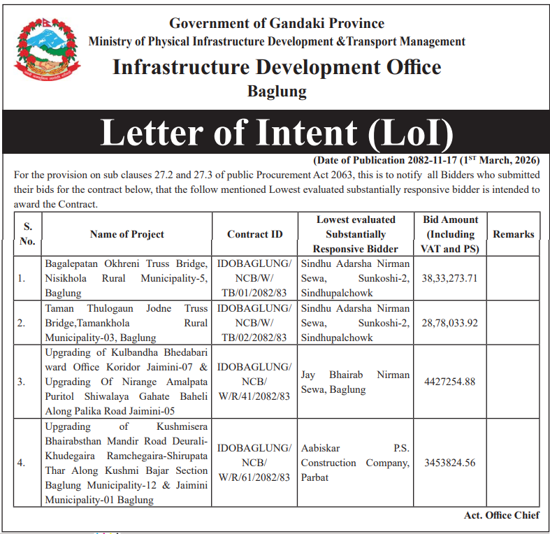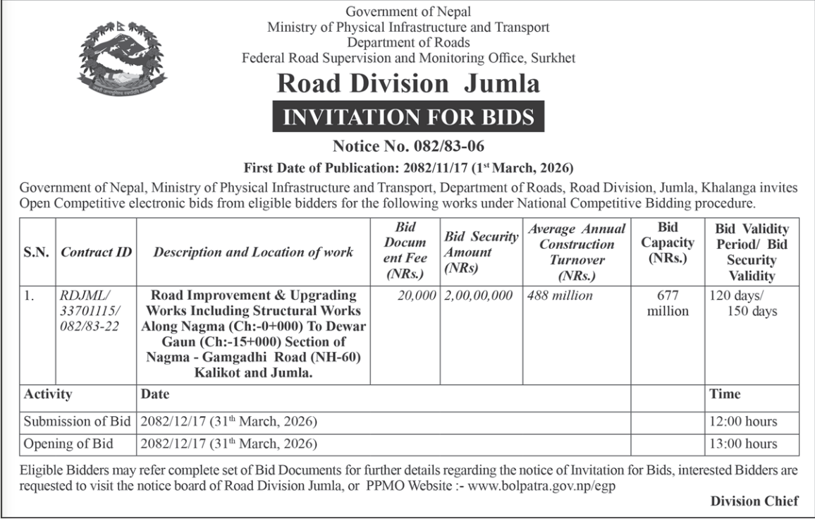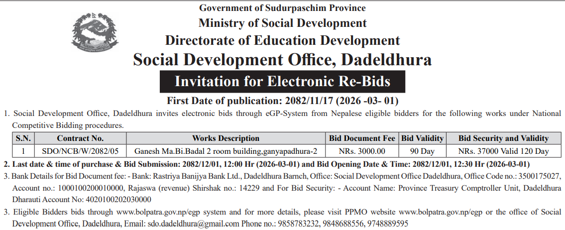 निर्माण सम्बन्धी प्रकाशित सम्पूर्ण ठेक्का टेन्डर तथा बोलपत्र सुचनाहरु प्रदेश अनुसार 08/03/2026 (Sunday)