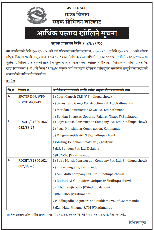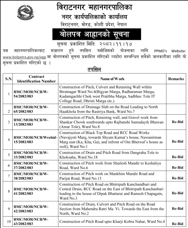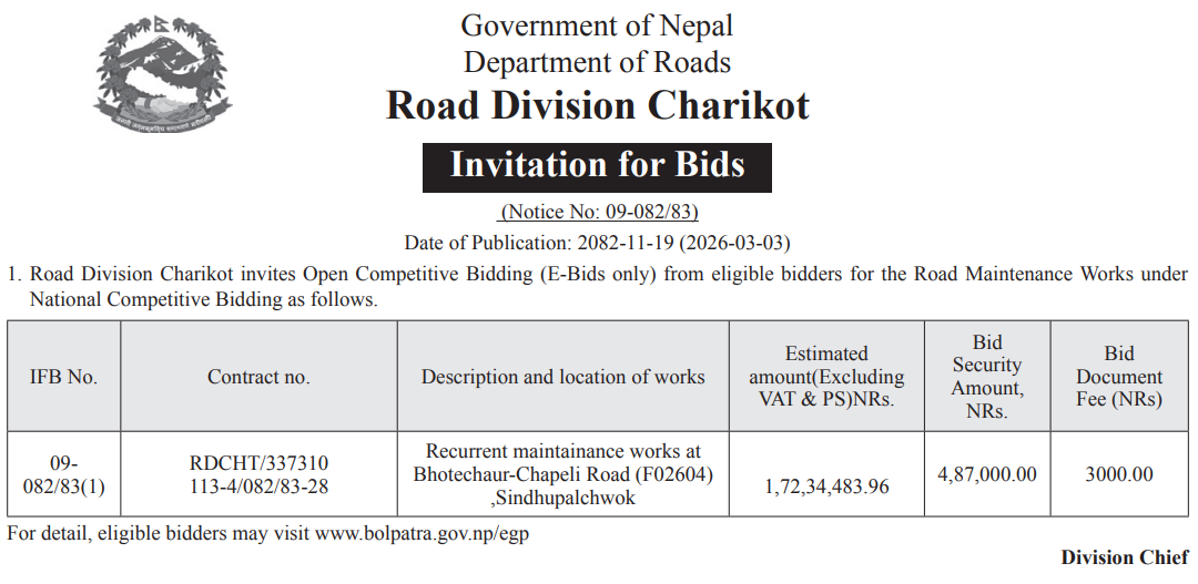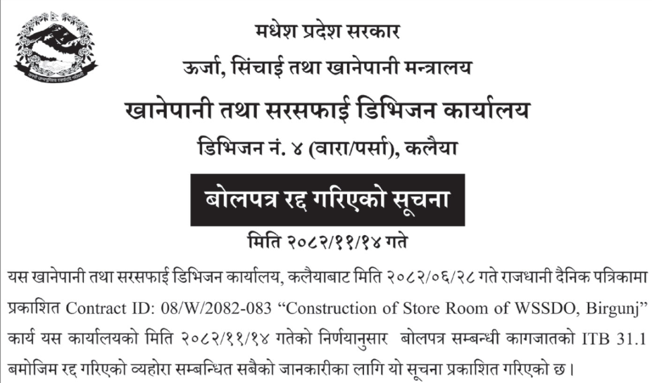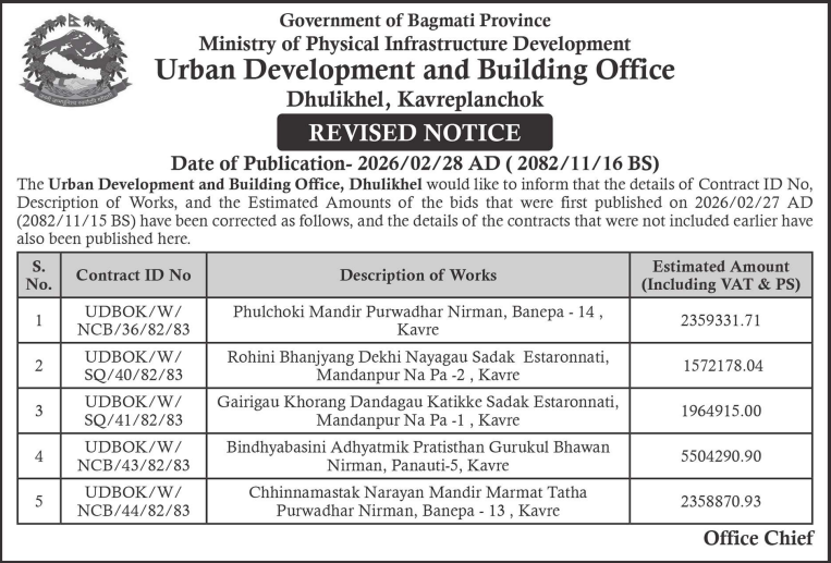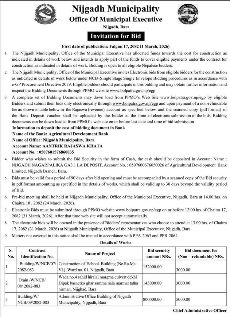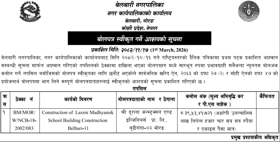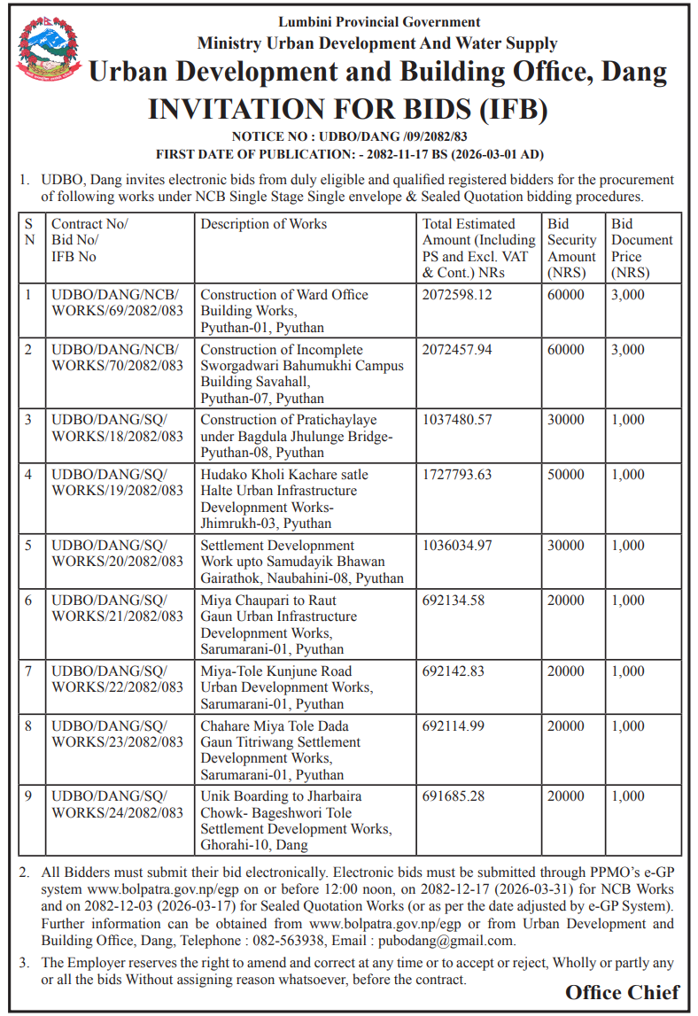 निर्माण सम्बन्धी प्रकाशित सम्पूर्ण ठेक्का टेन्डर तथा बोलपत्र सुचनाहरु प्रदेश अनुसार 08/03/2026 (Sunday)