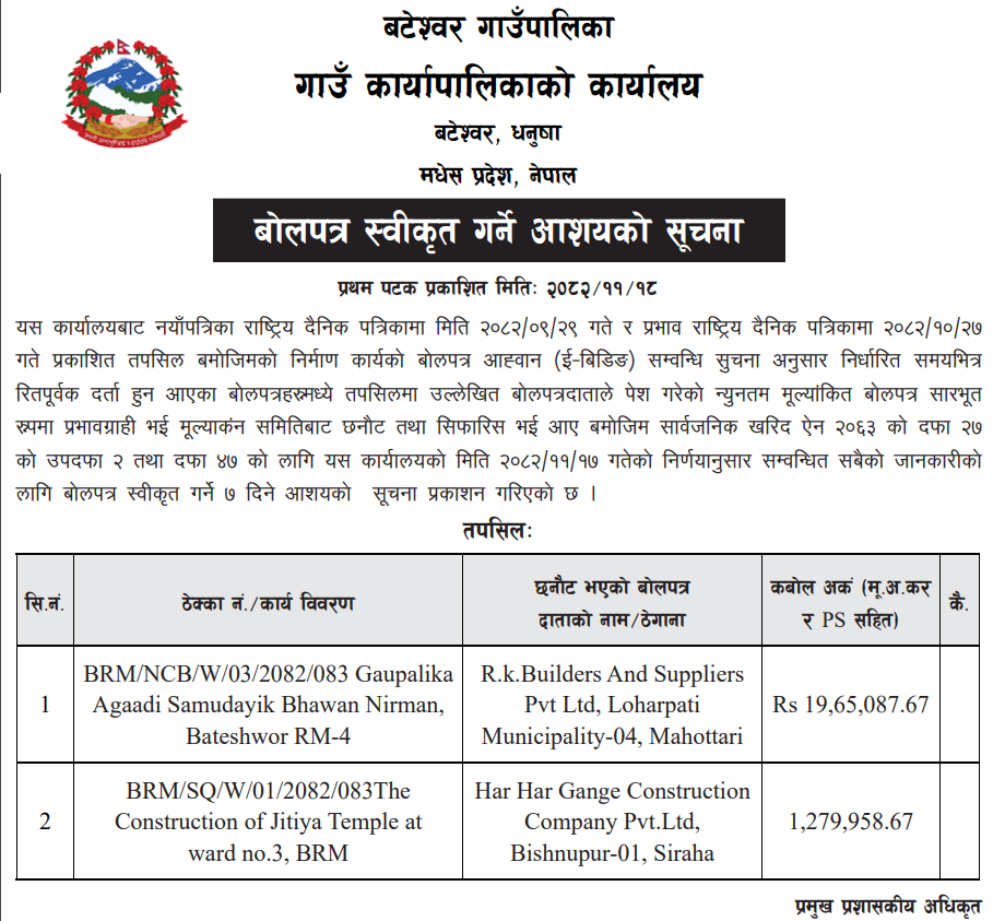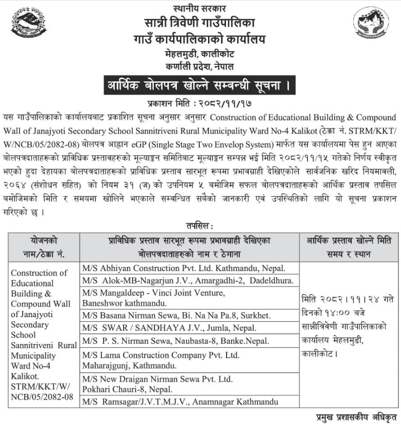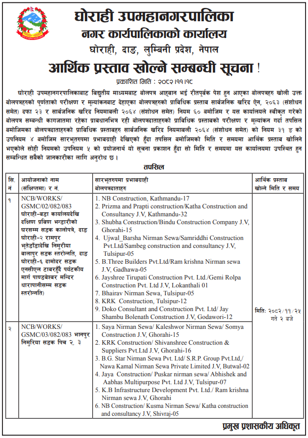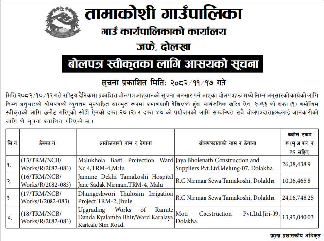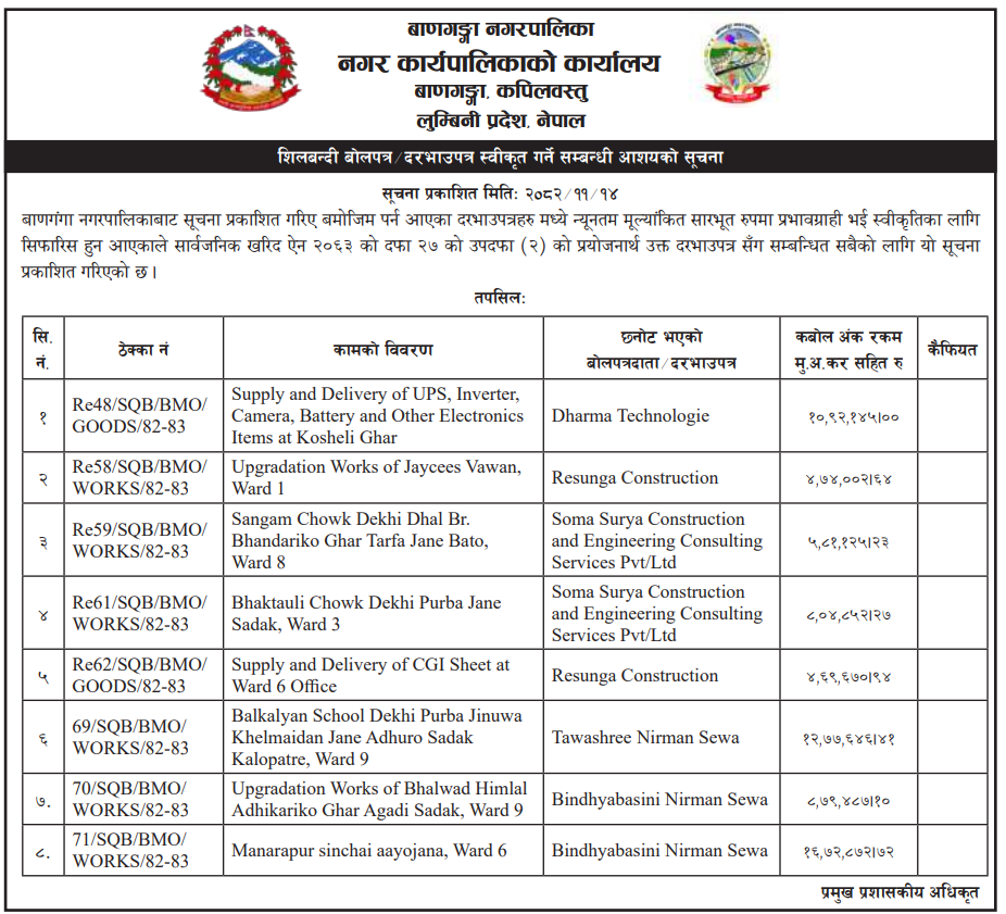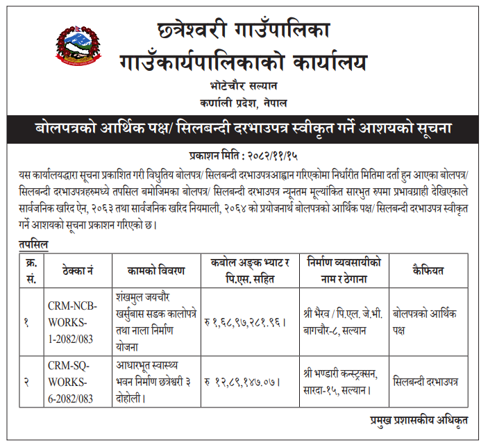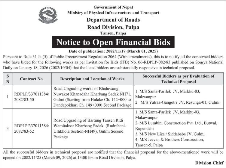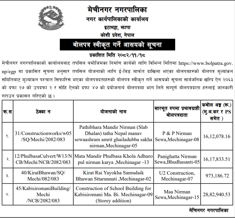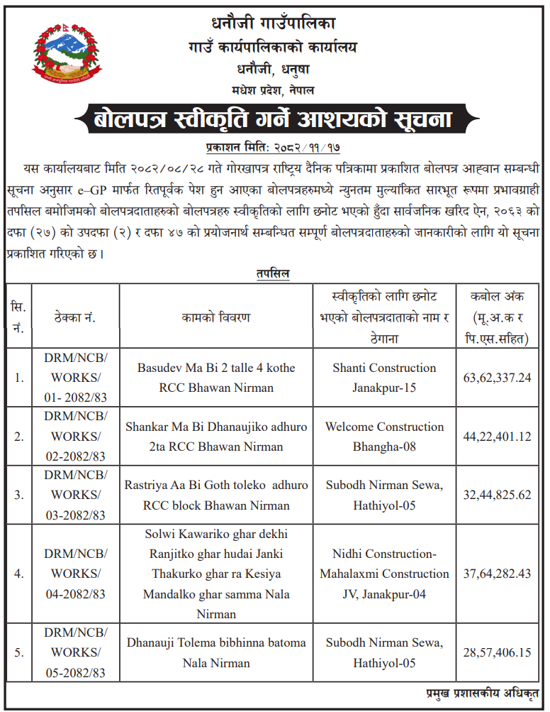 निर्माण सम्बन्धी प्रकाशित सम्पूर्ण ठेक्का टेन्डर तथा बोलपत्र सुचनाहरु प्रदेश अनुसार 08/03/2026 (Sunday)