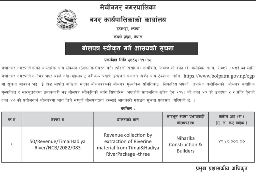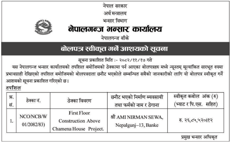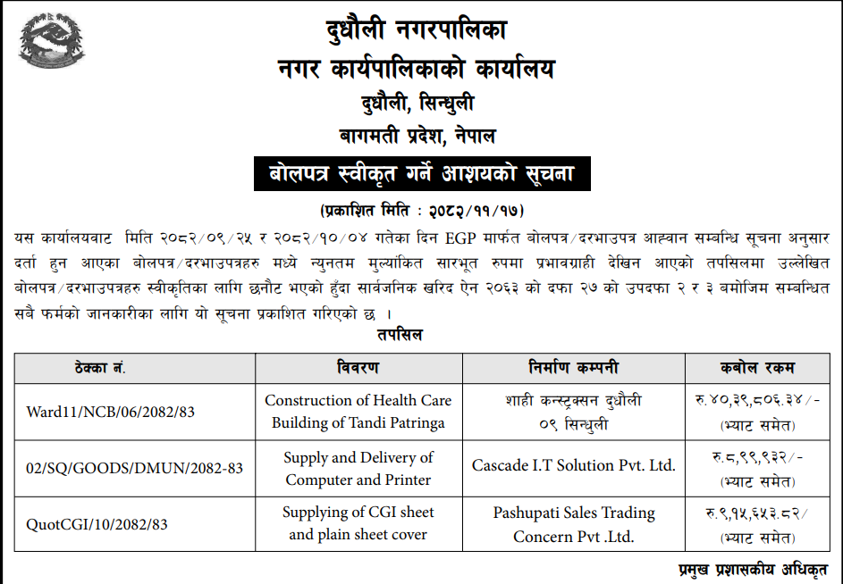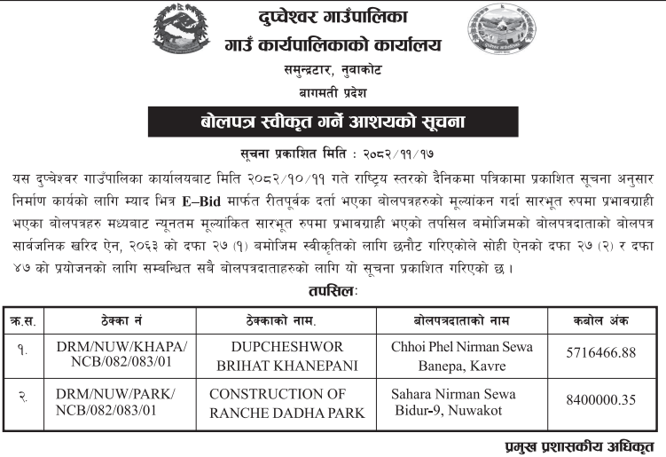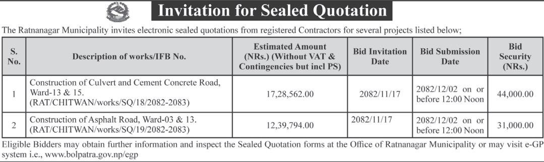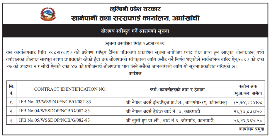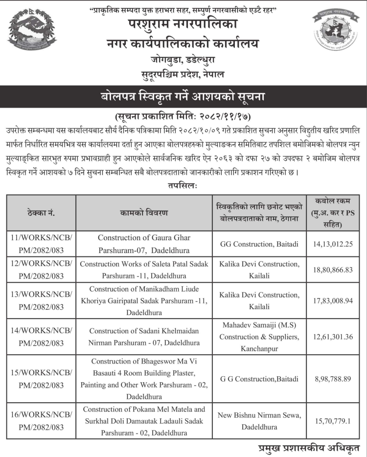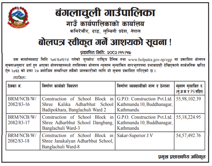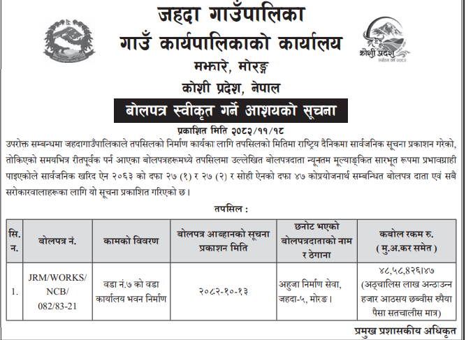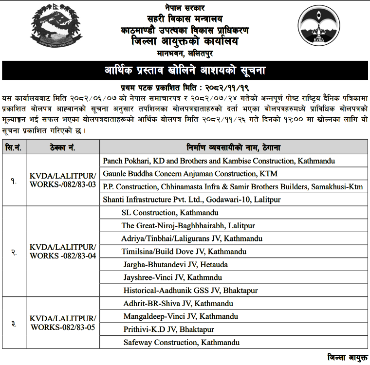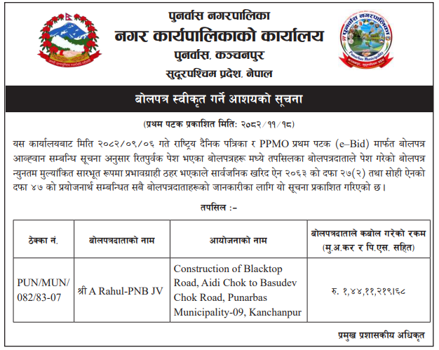 निर्माण सम्बन्धी प्रकाशित सम्पूर्ण ठेक्का टेन्डर तथा बोलपत्र सुचनाहरु प्रदेश अनुसार 08/03/2026 (Sunday)