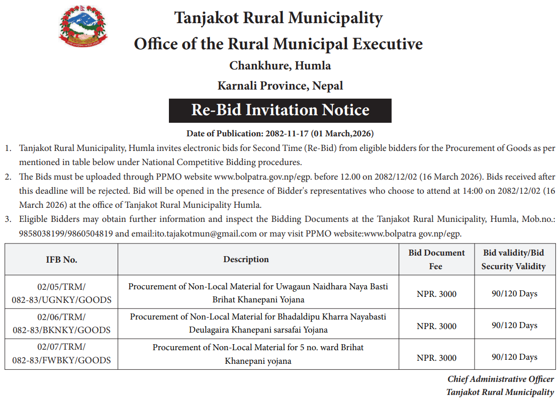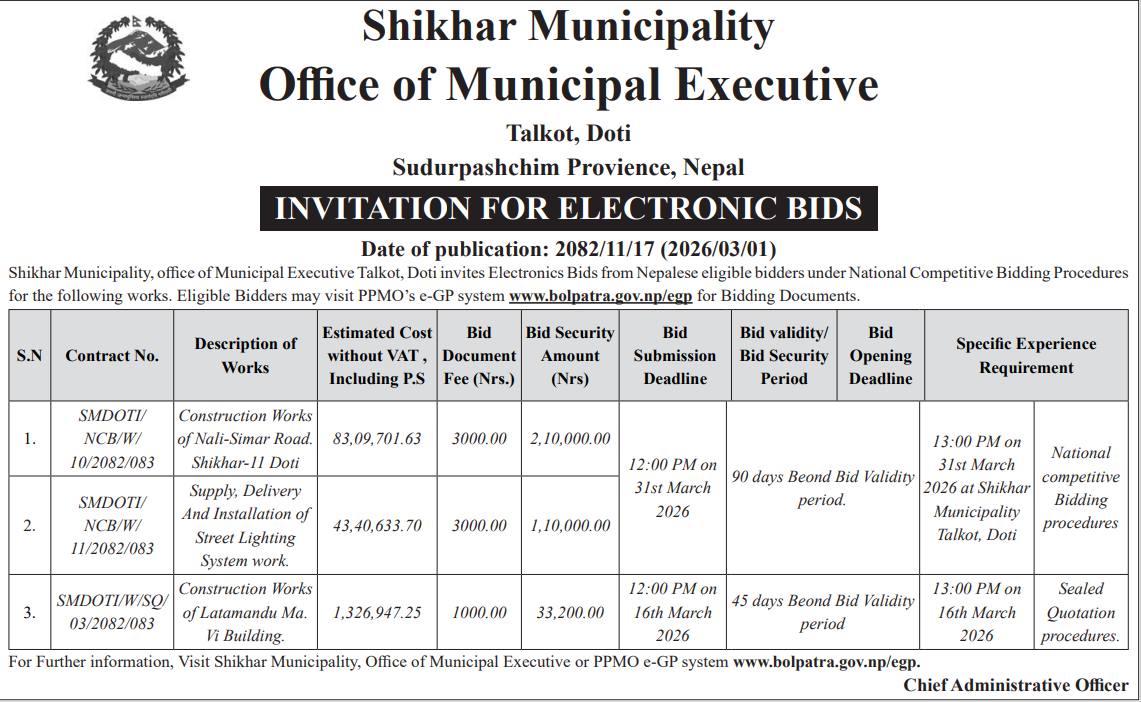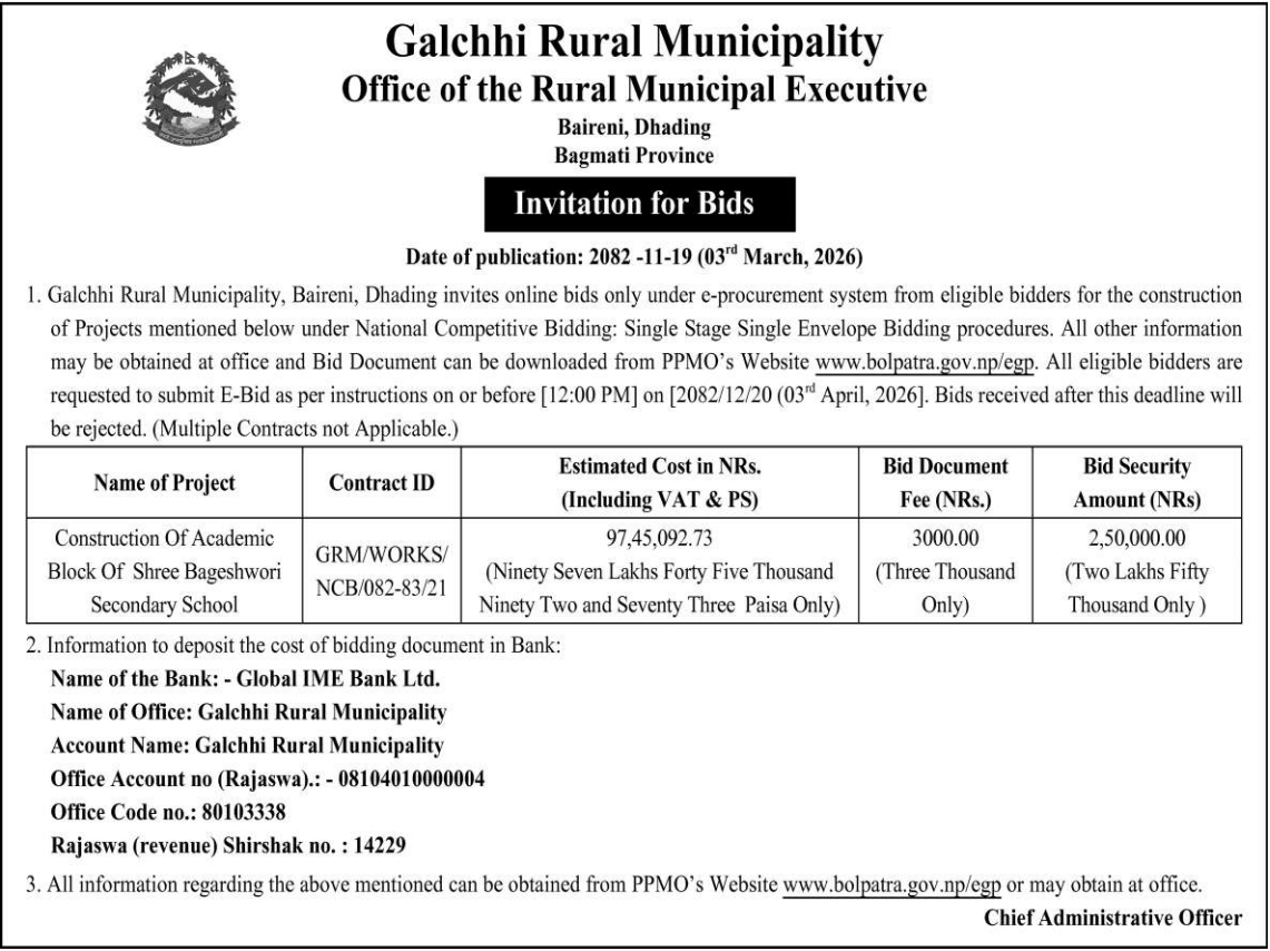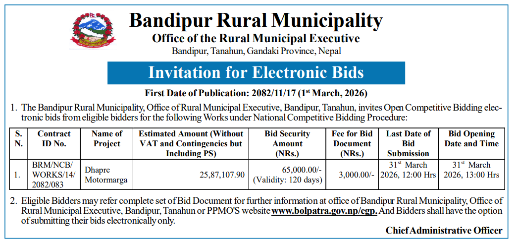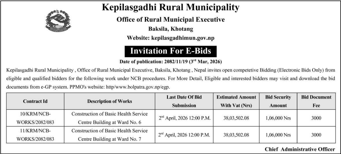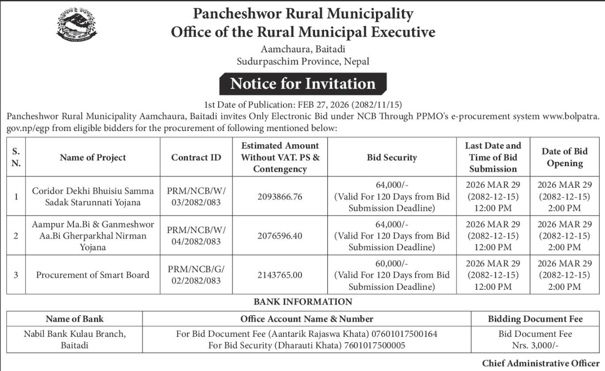 | 15 | Ajirkot Rural Municipality, Gorkha | Installation of CCTV Cameras at various locations within Ajirkot RM 03 | 03/03/2026 | PPMO | 02/04/2026 | Click Here | |