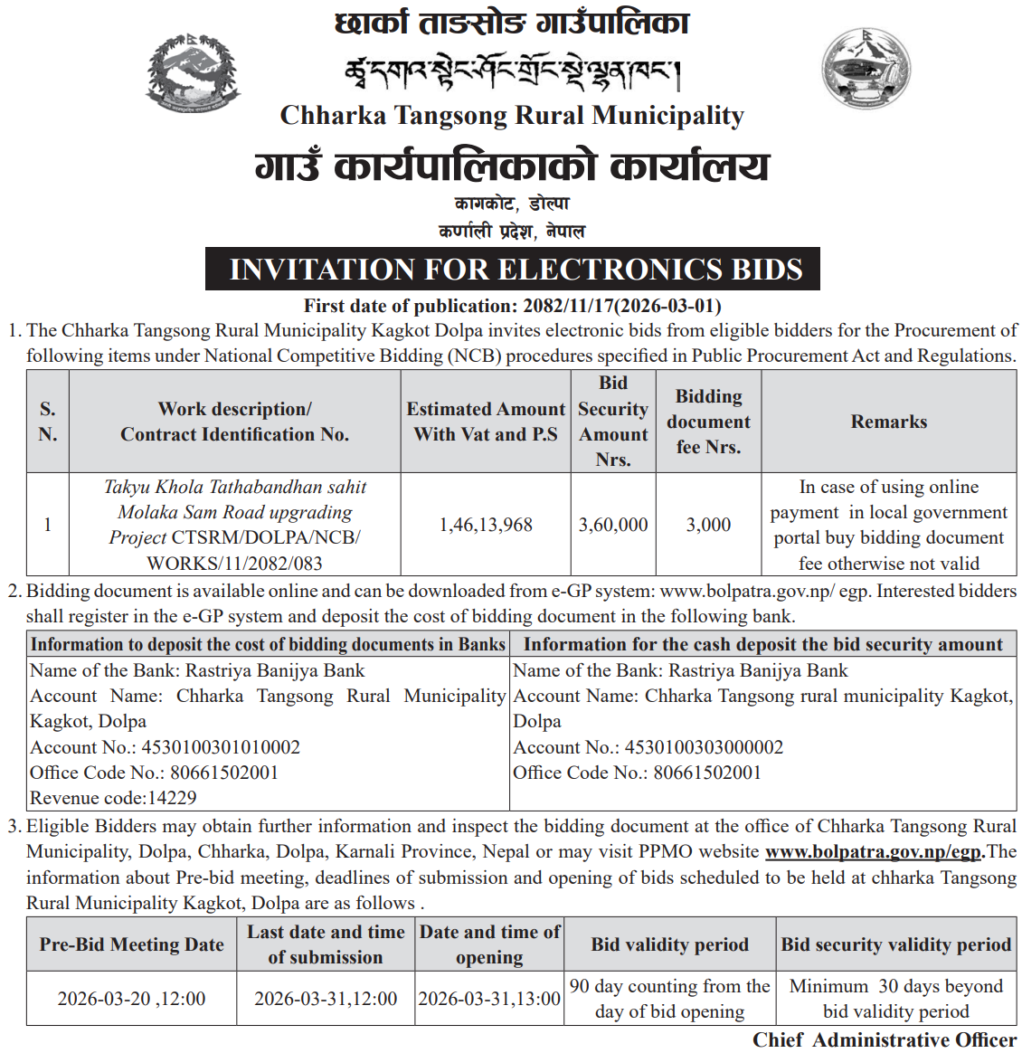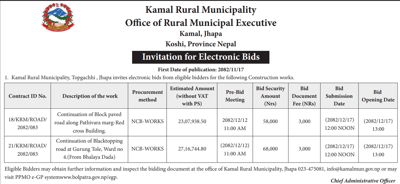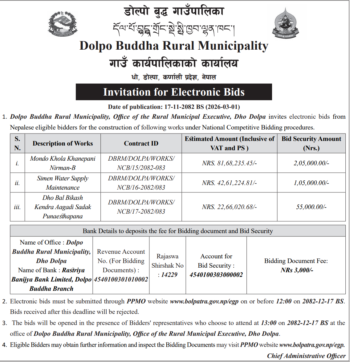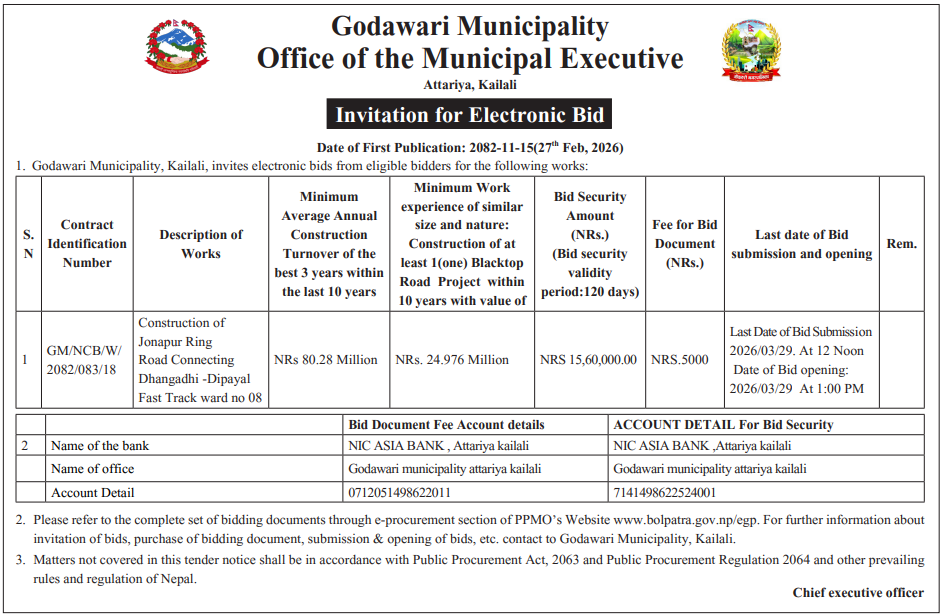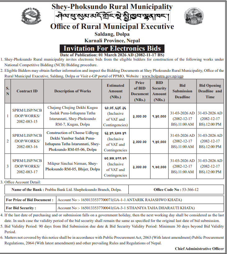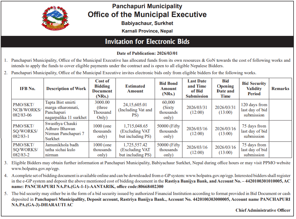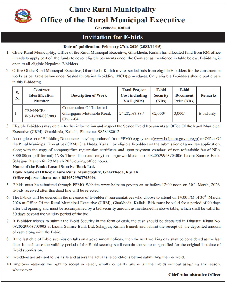 | 15 | Ajirkot Rural Municipality, Gorkha | Installation of CCTV Cameras at various locations within Ajirkot RM 03 | 03/03/2026 | PPMO | 02/04/2026 | Click Here | |