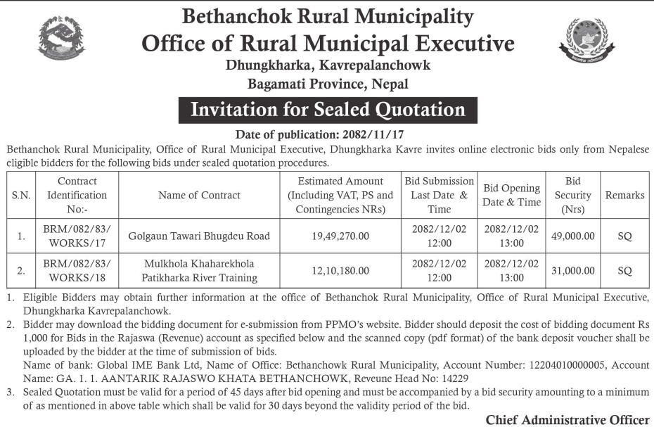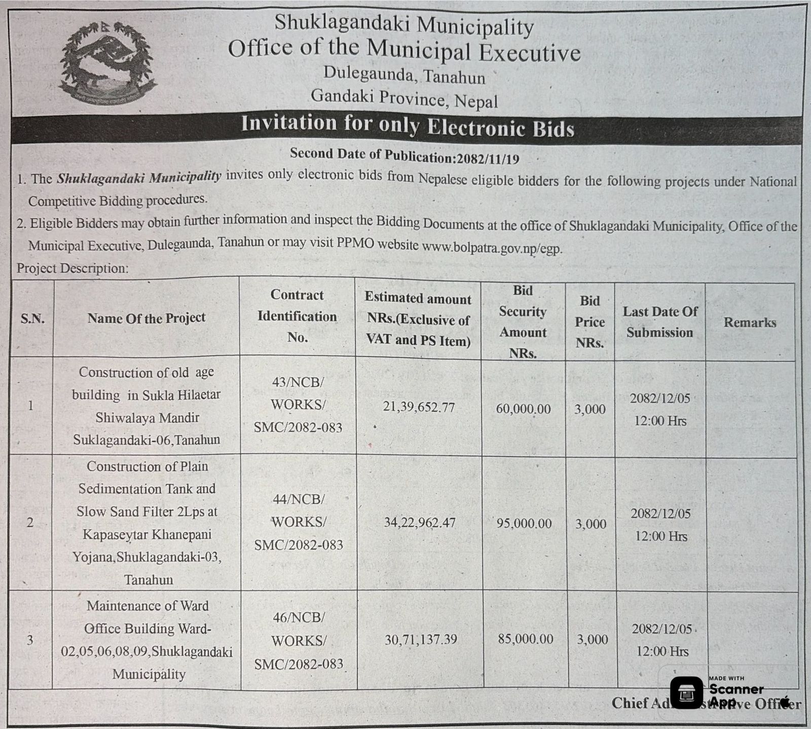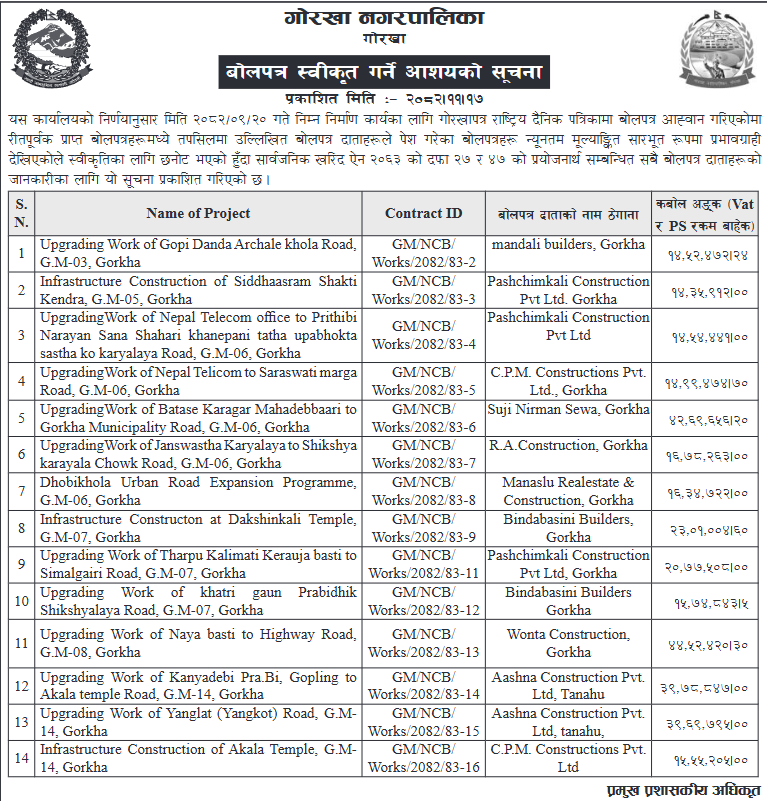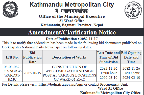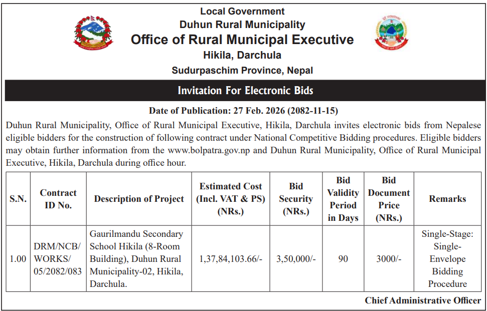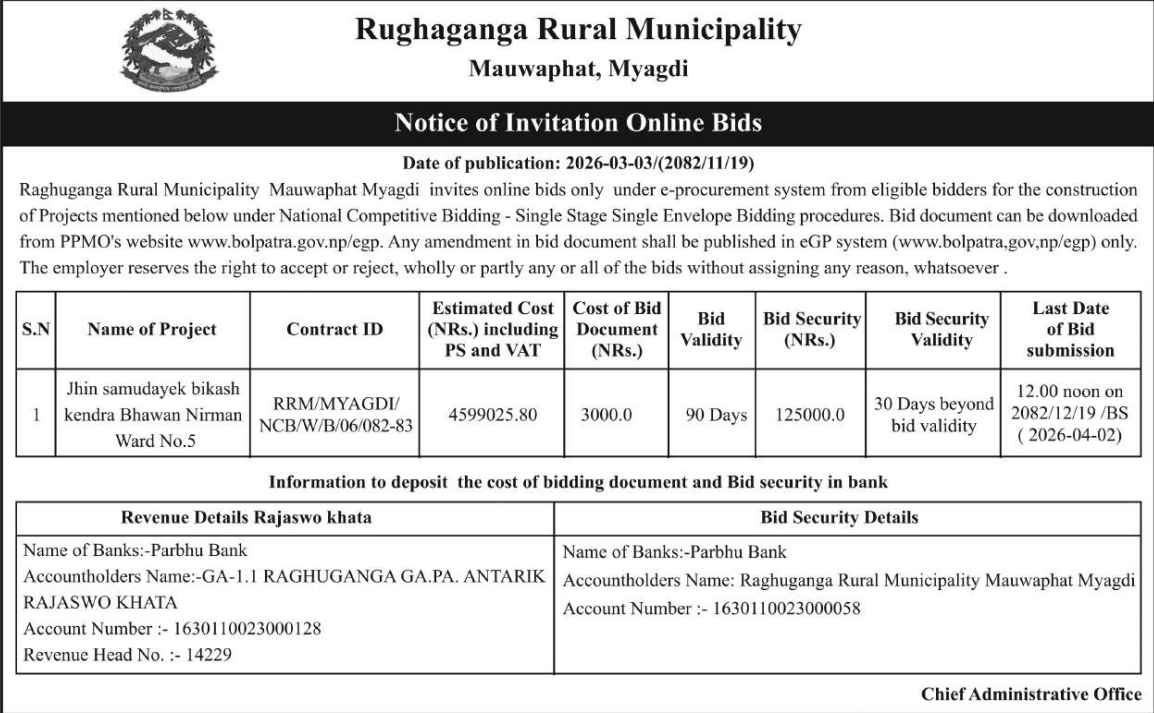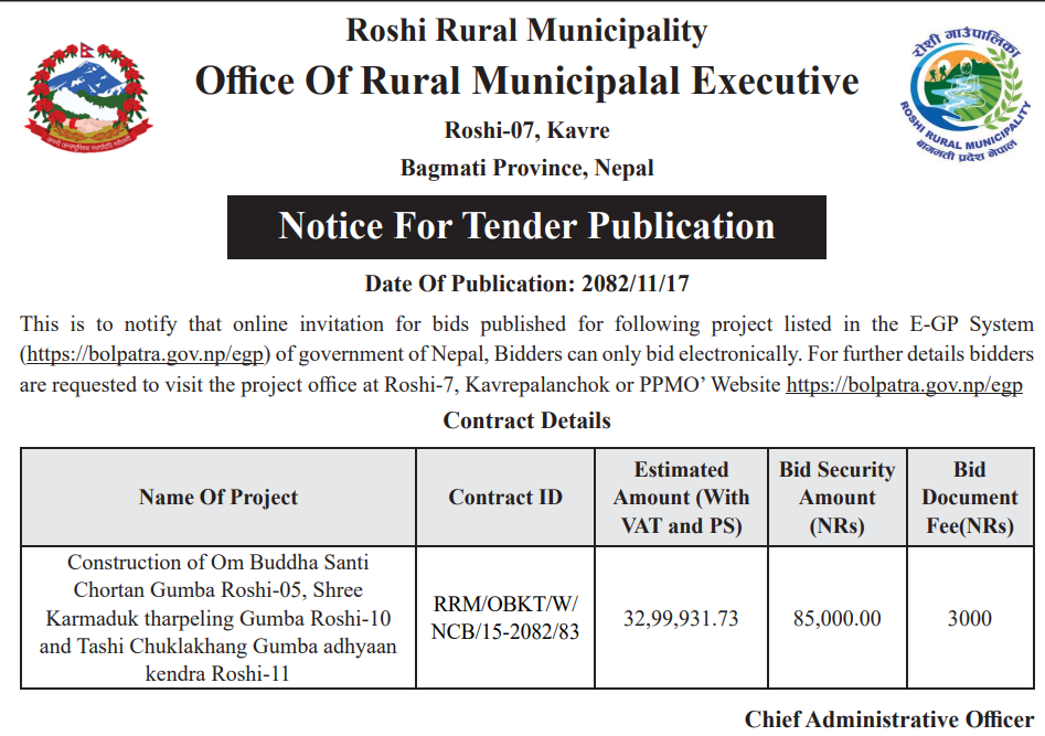 | 15 | Ajirkot Rural Municipality, Gorkha | Installation of CCTV Cameras at various locations within Ajirkot RM 03 | 03/03/2026 | PPMO | 02/04/2026 | Click Here | |