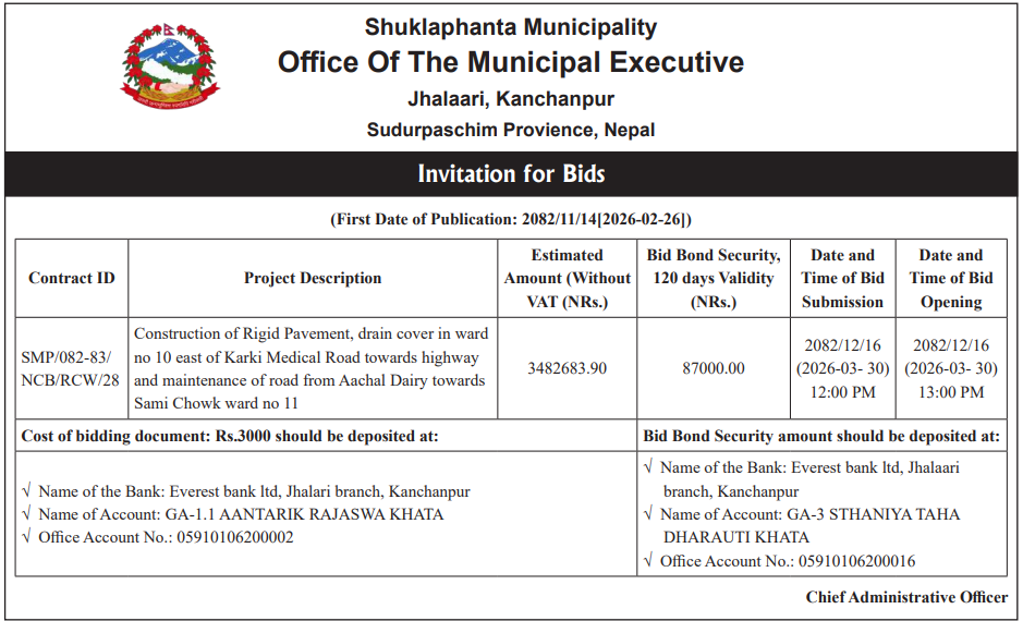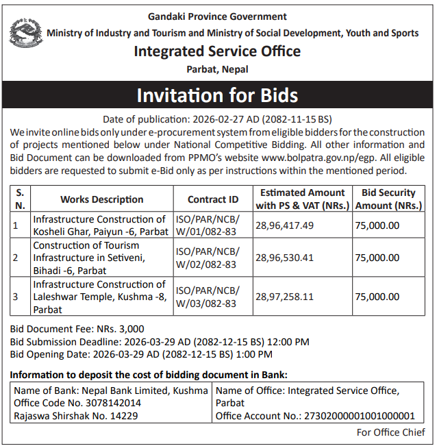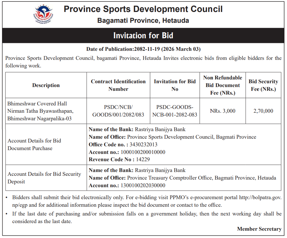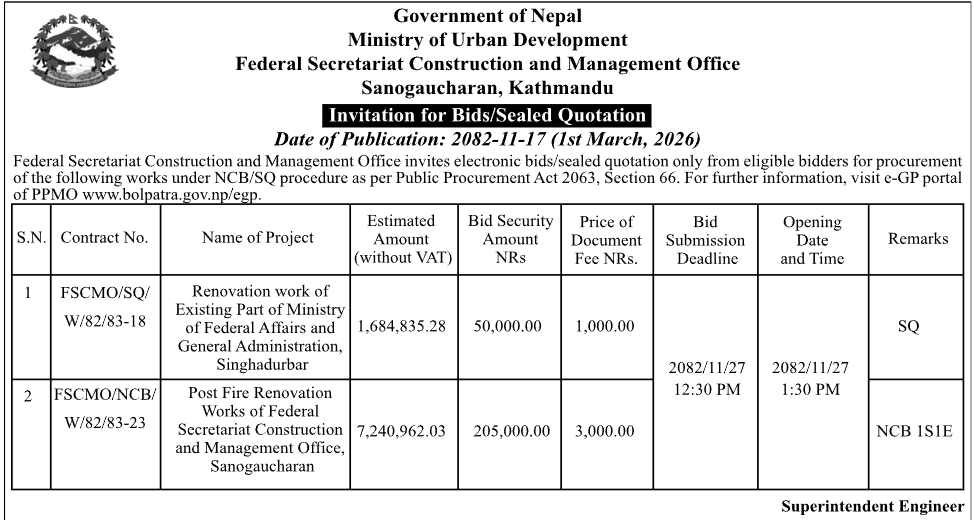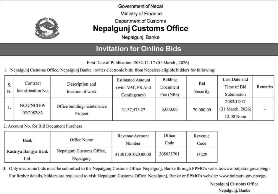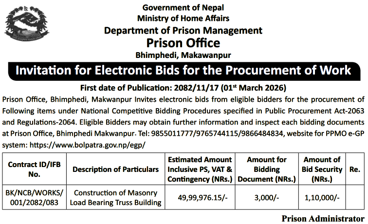 | 27 | Nepal Police Headquarter Procurememt Section, Naxal | Supply and Delivery of Assault Vest | 03/03/2026 | PPMO | 02/04/2026 | Click Here | |