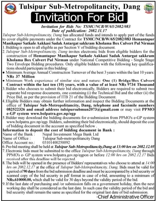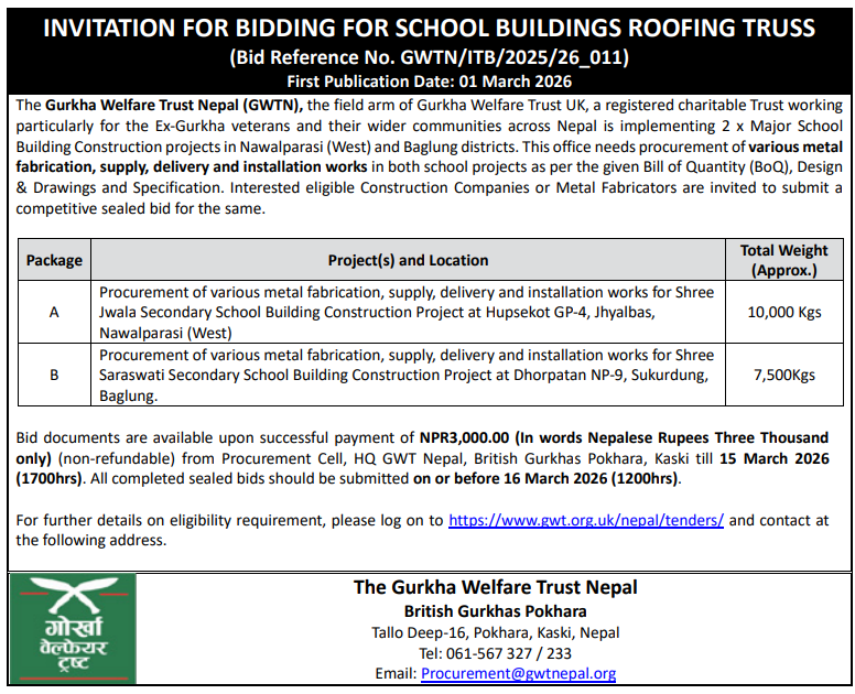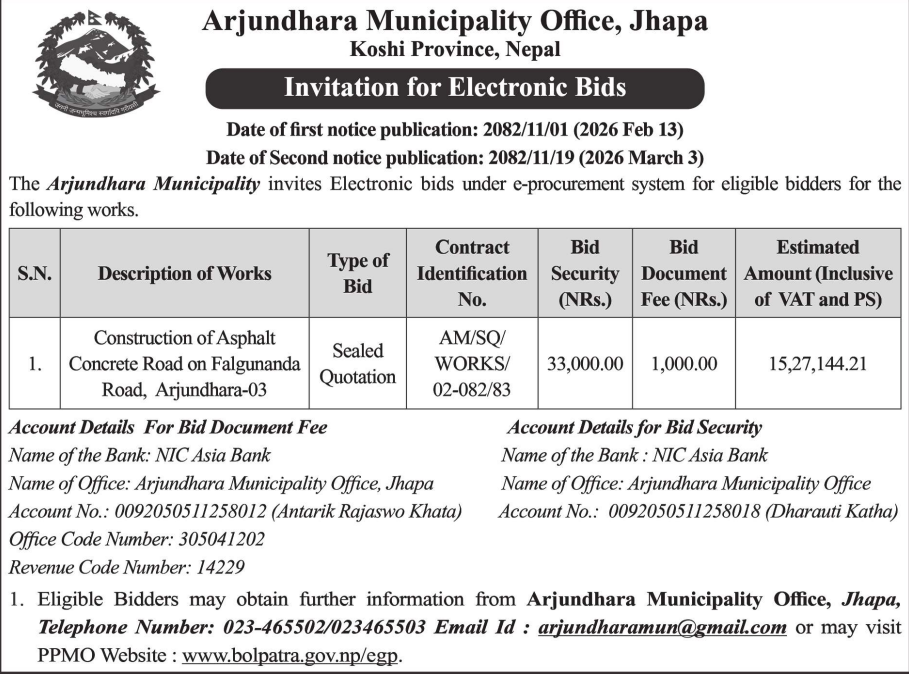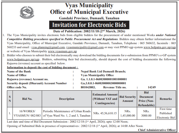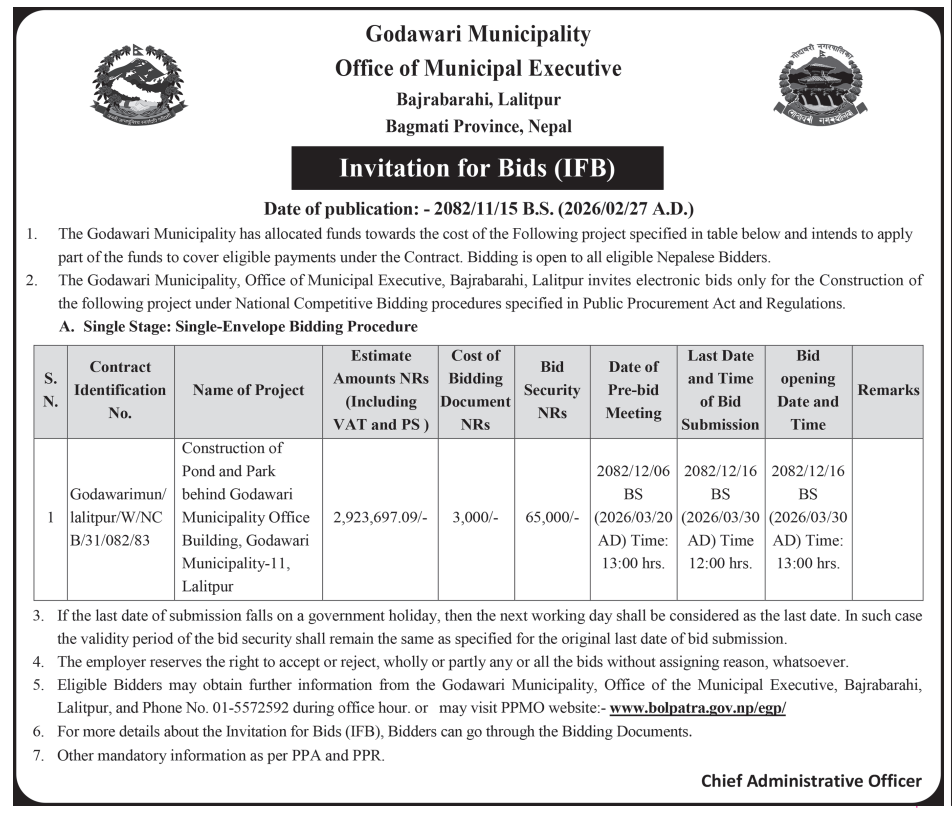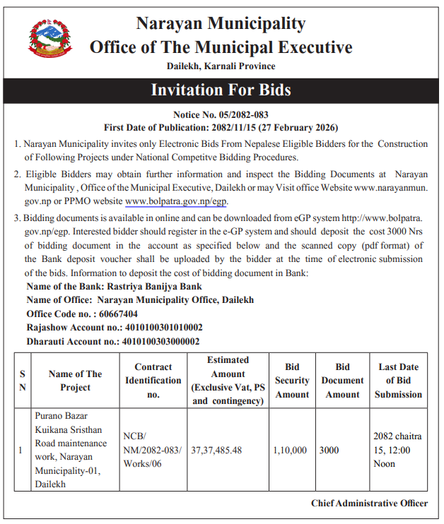 | 27 | Nepal Police Headquarter Procurememt Section, Naxal | Supply and Delivery of Assault Vest | 03/03/2026 | PPMO | 02/04/2026 | Click Here | |