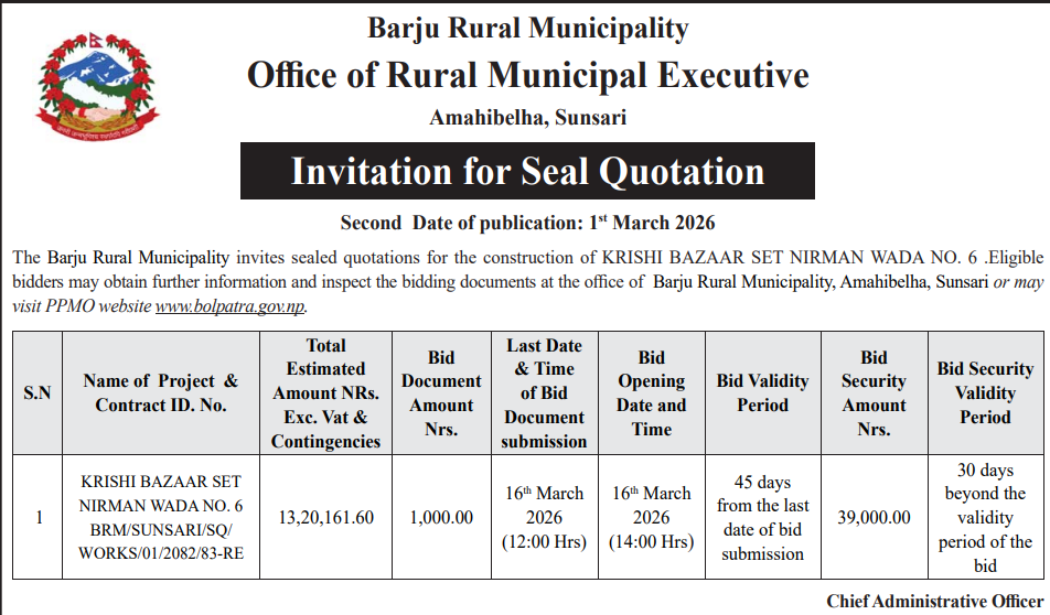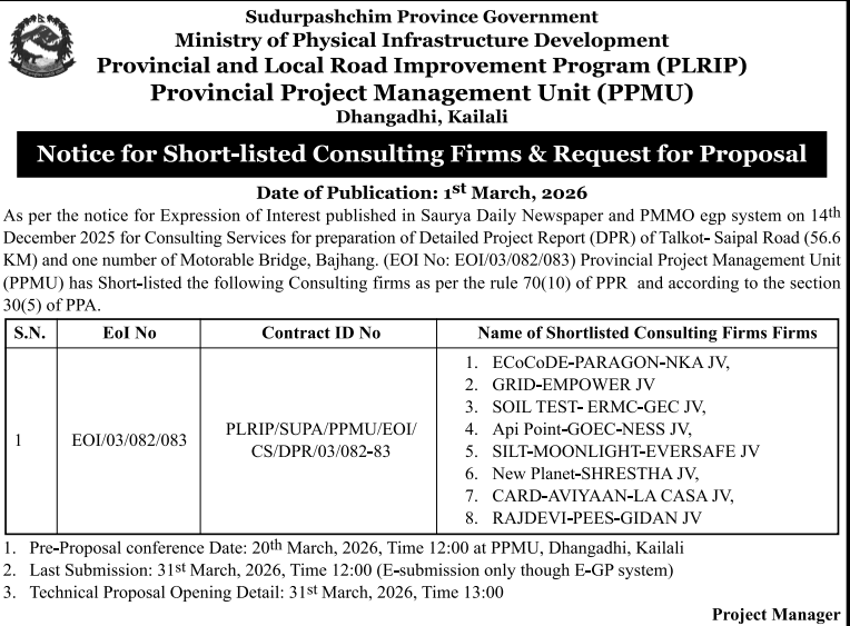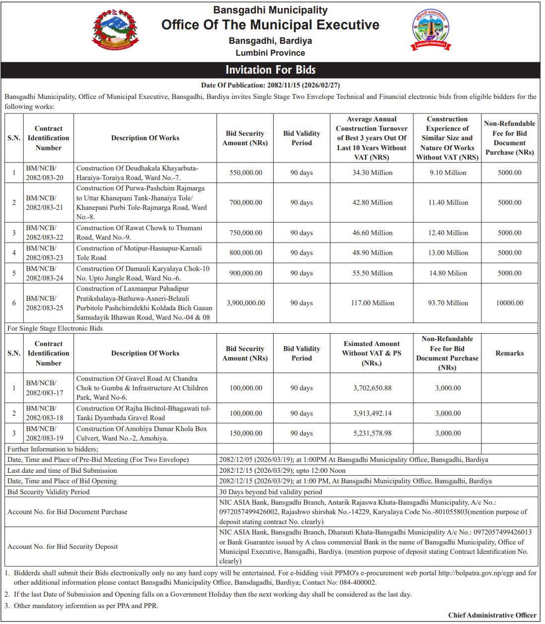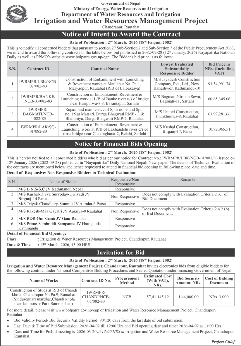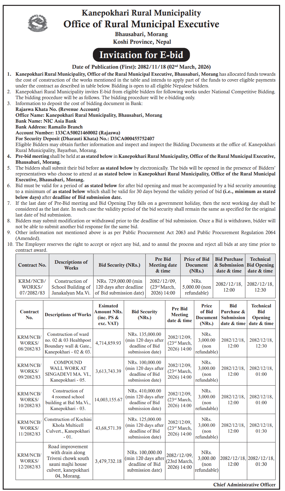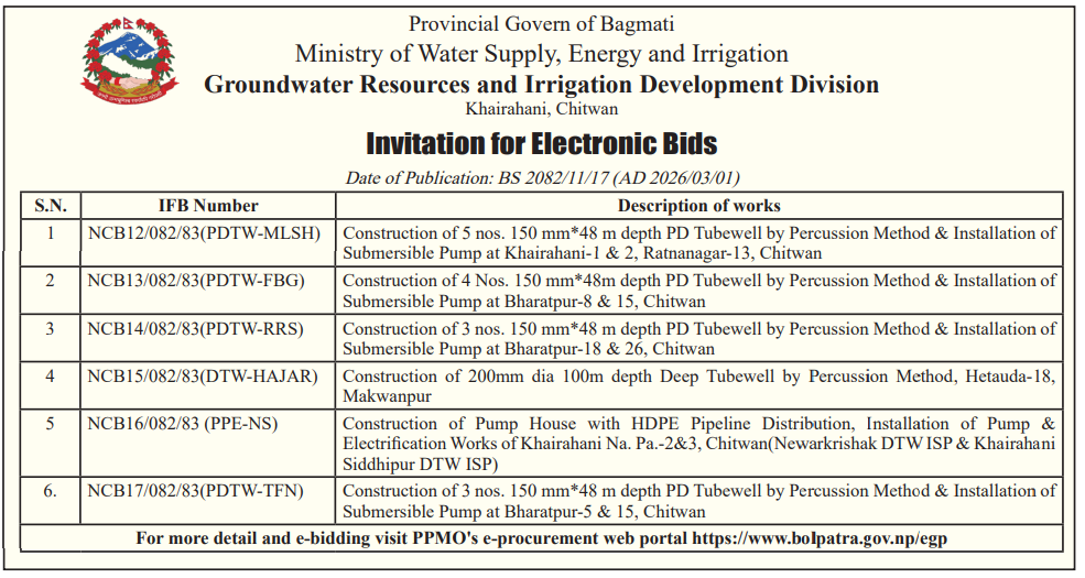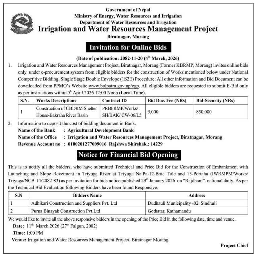 | 14 | Koshi and Bokraha river Management Project | Construction of CBDRM Shelter House-Bakraha River Basin | 04/03/2026 | PPMO | 05/04/2026 | Click Here | |