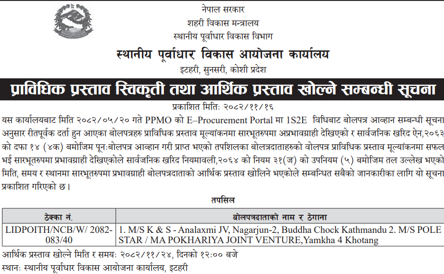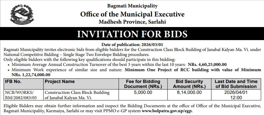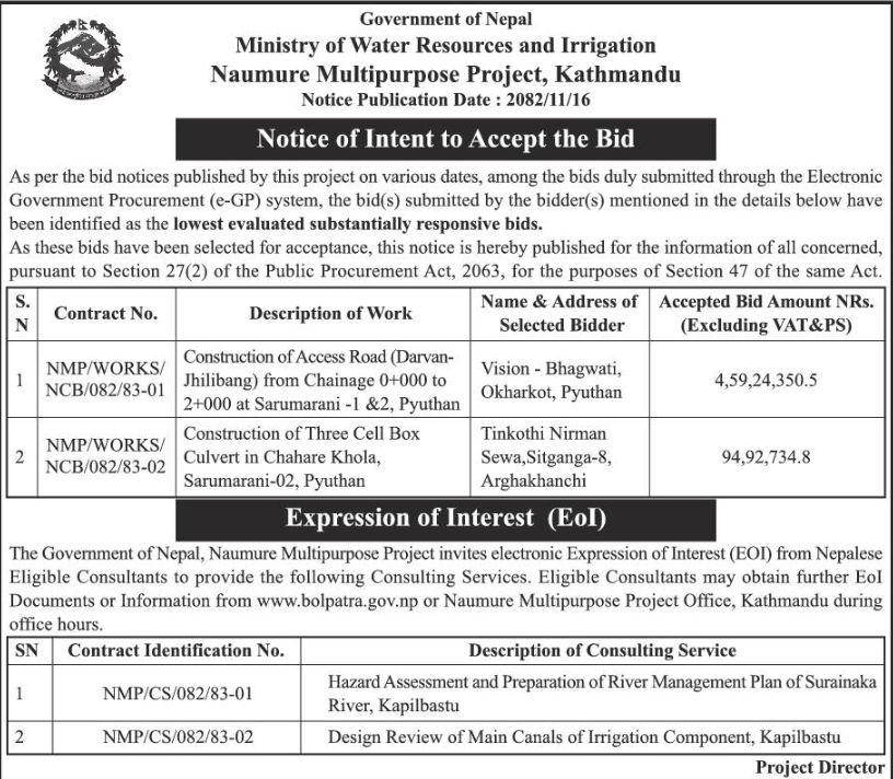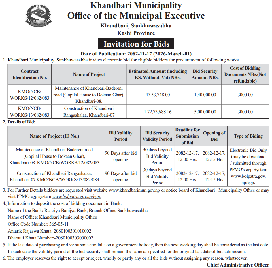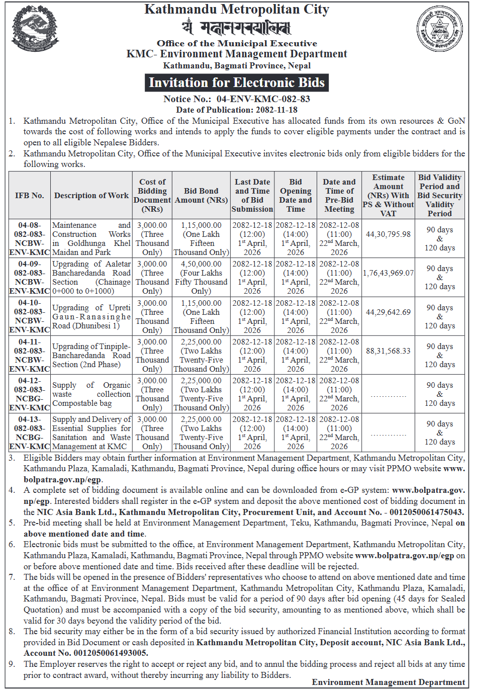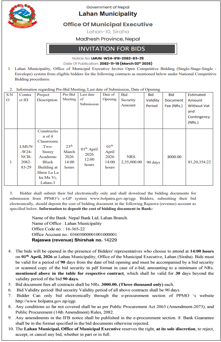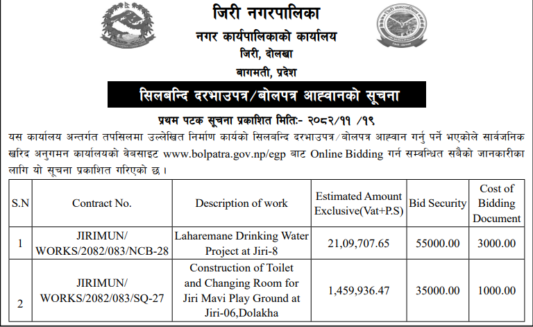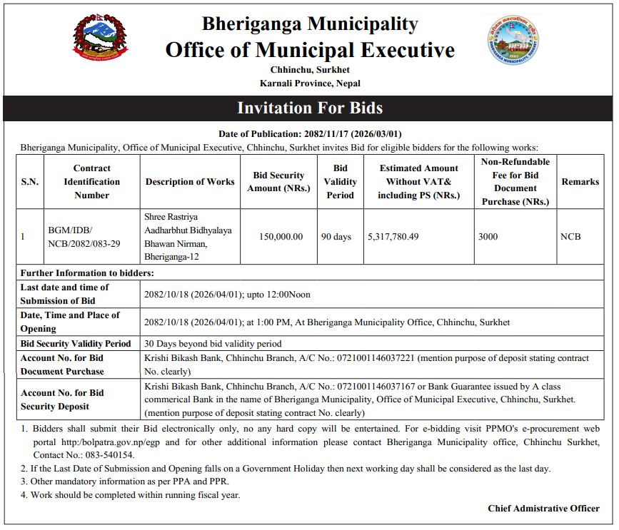 | 14 | Koshi and Bokraha river Management Project | Construction of CBDRM Shelter House-Bakraha River Basin | 04/03/2026 | PPMO | 05/04/2026 | Click Here | |