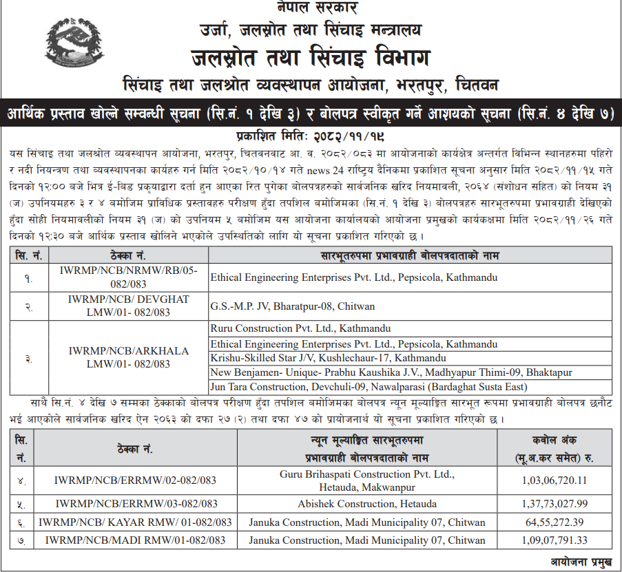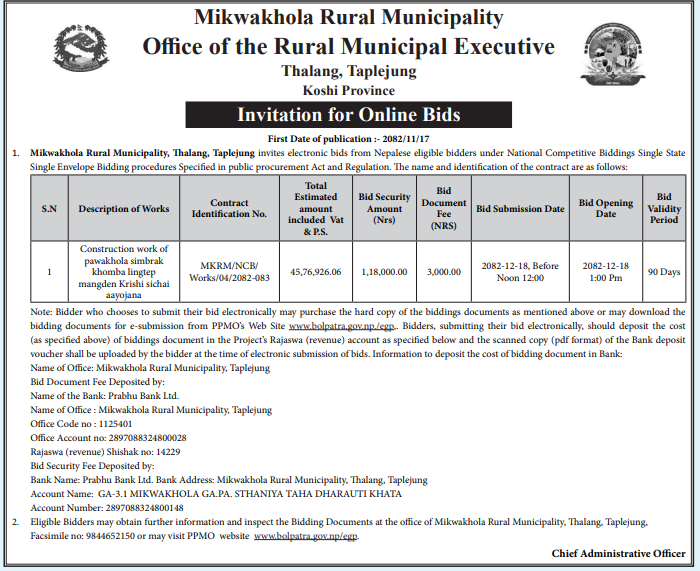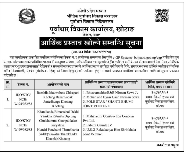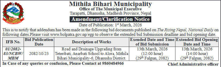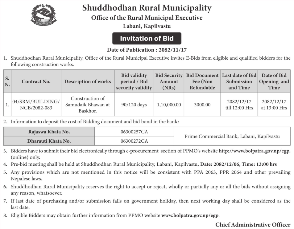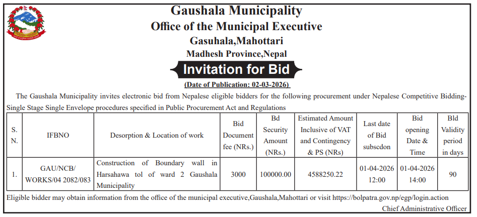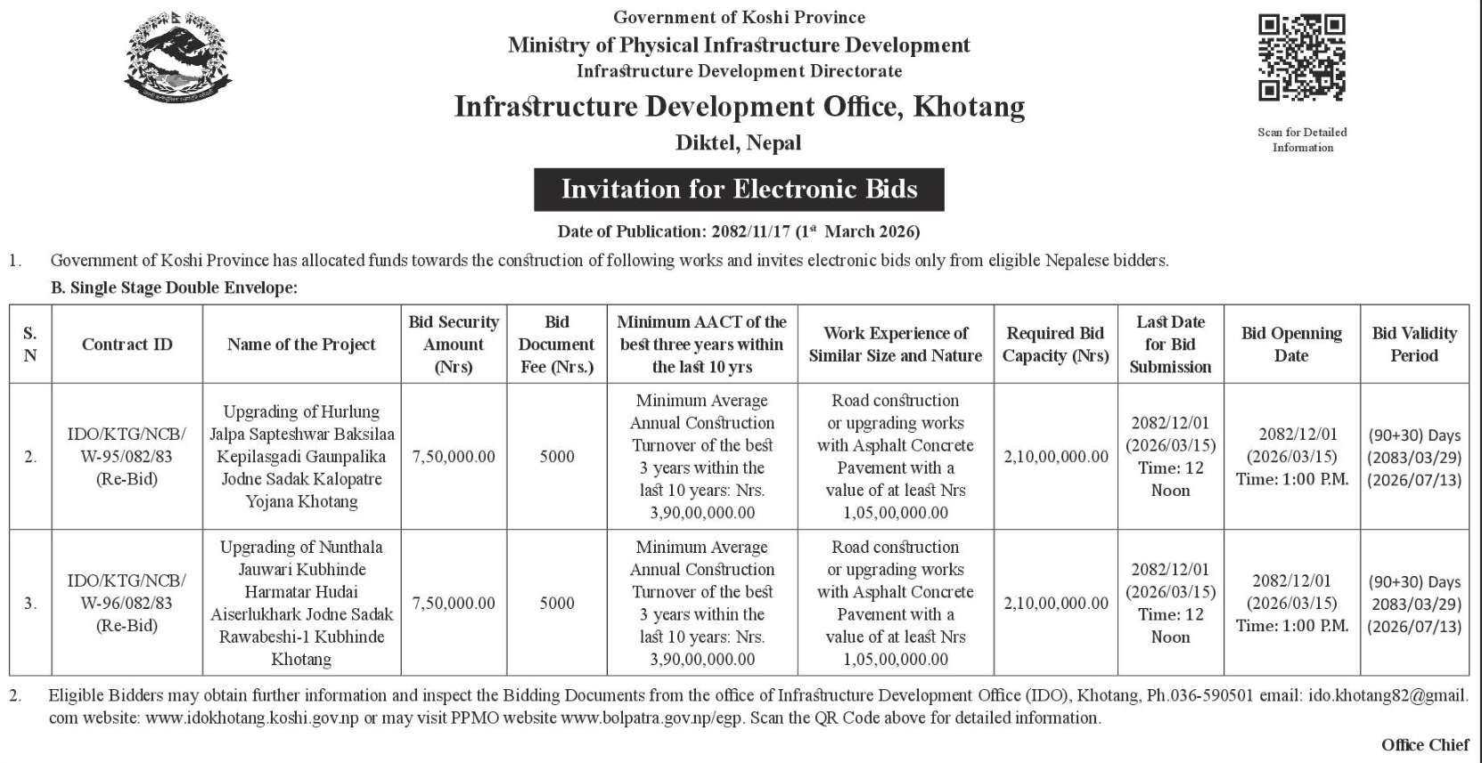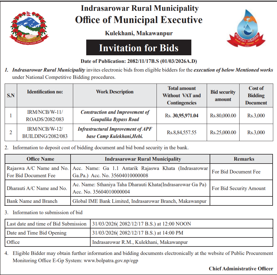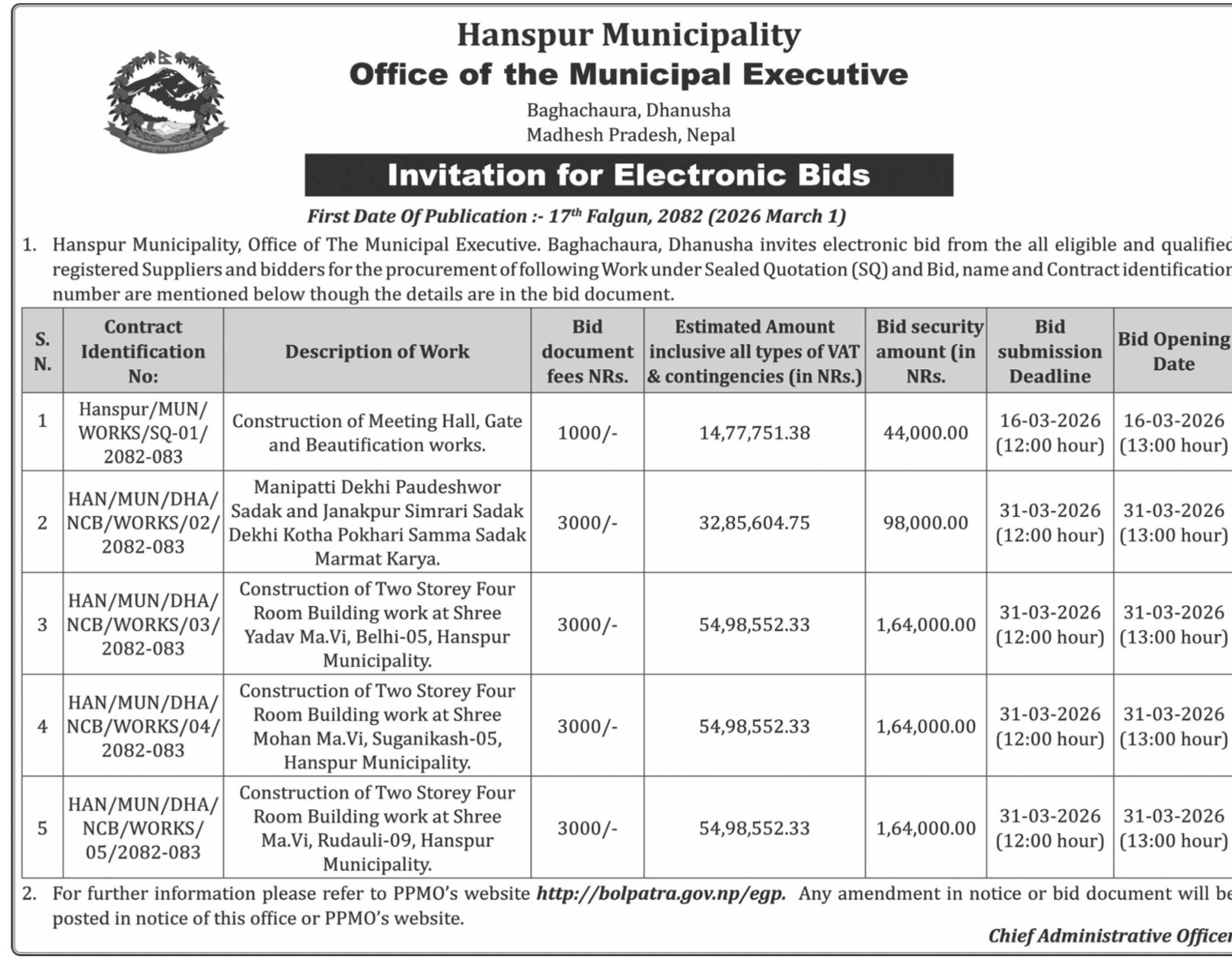 | 14 | Koshi and Bokraha river Management Project | Construction of CBDRM Shelter House-Bakraha River Basin | 04/03/2026 | PPMO | 05/04/2026 | Click Here | |