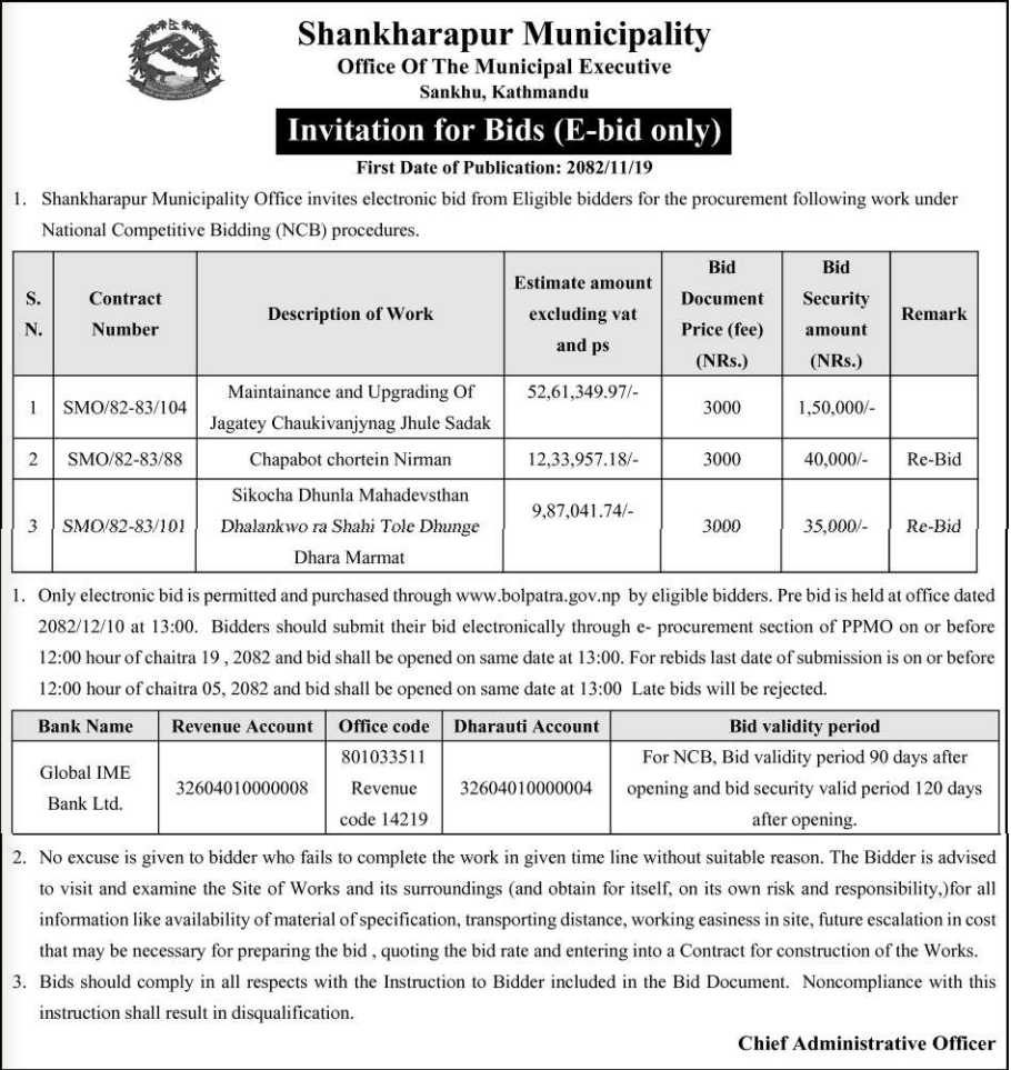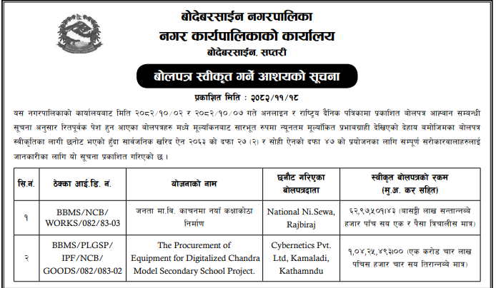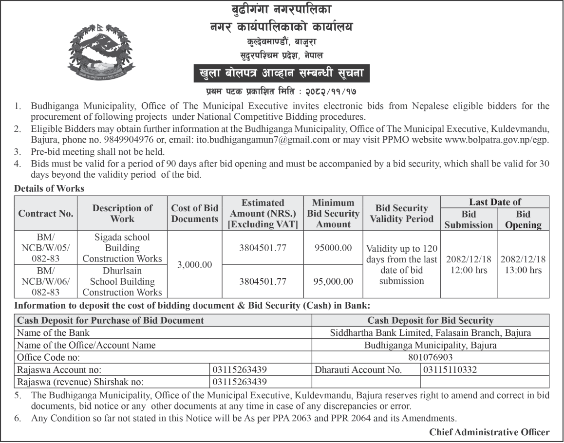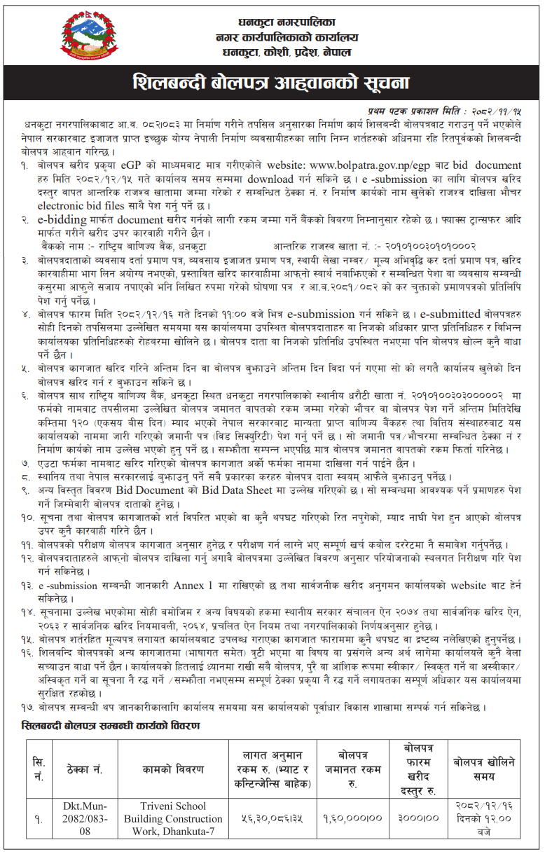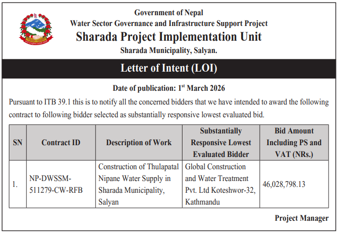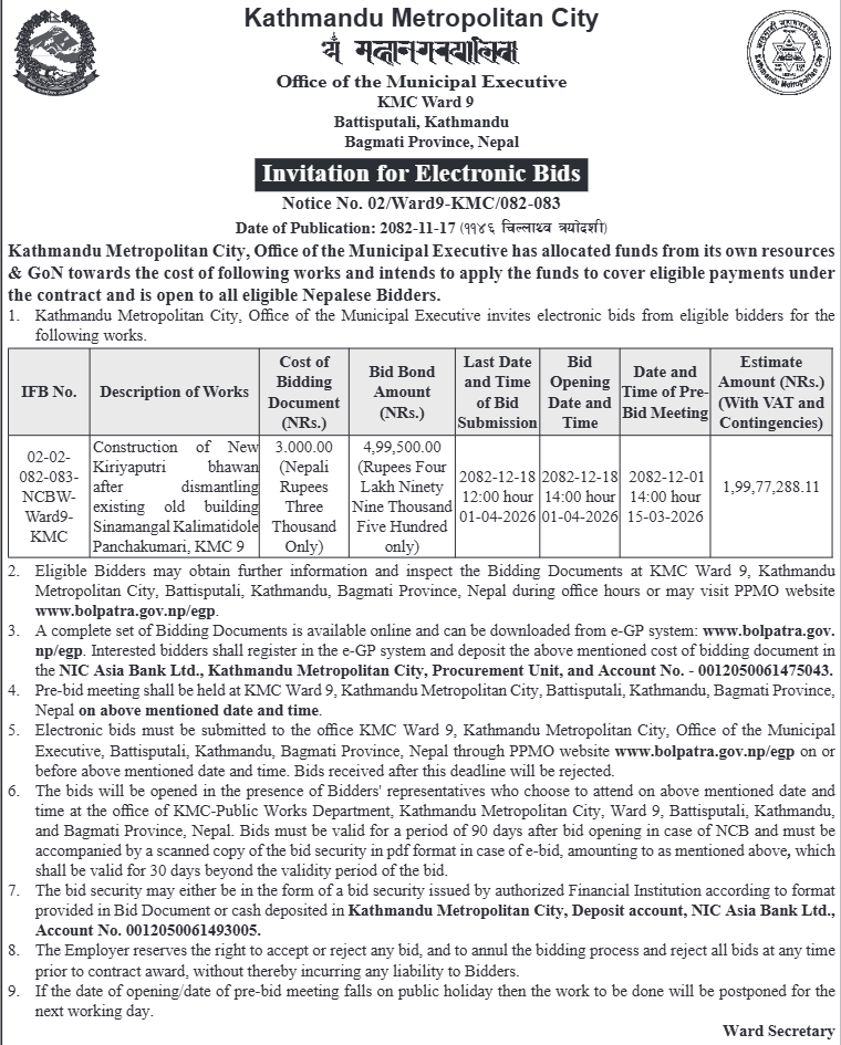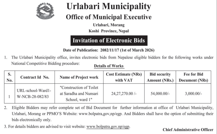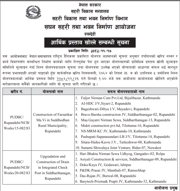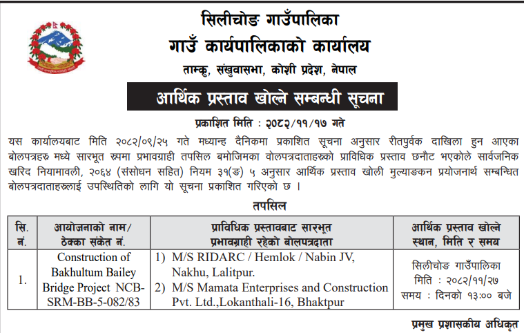 | 14 | Koshi and Bokraha river Management Project | Construction of CBDRM Shelter House-Bakraha River Basin | 04/03/2026 | PPMO | 05/04/2026 | Click Here | |