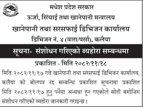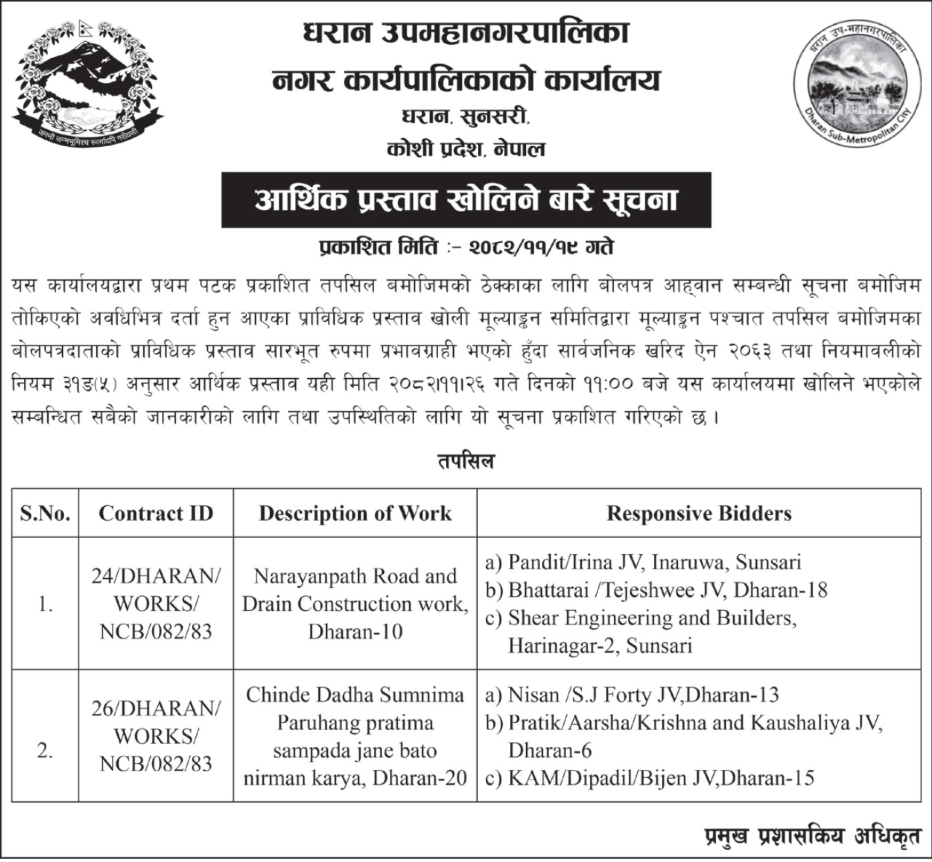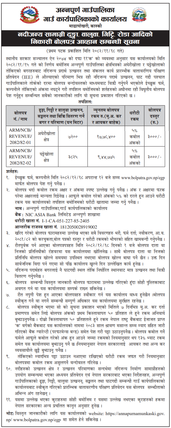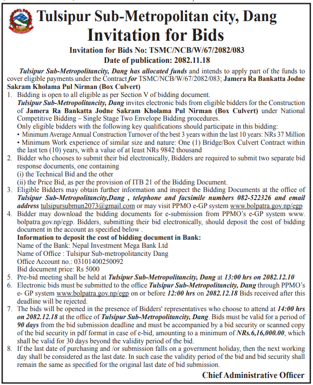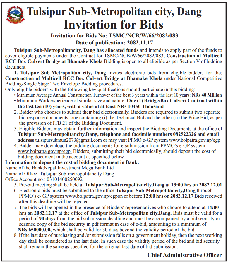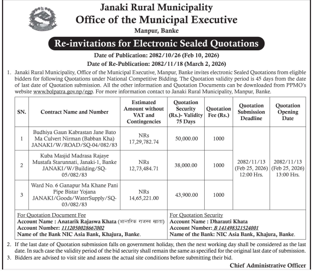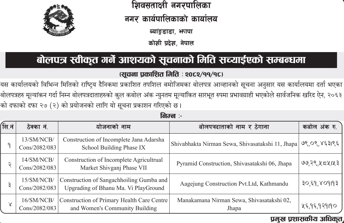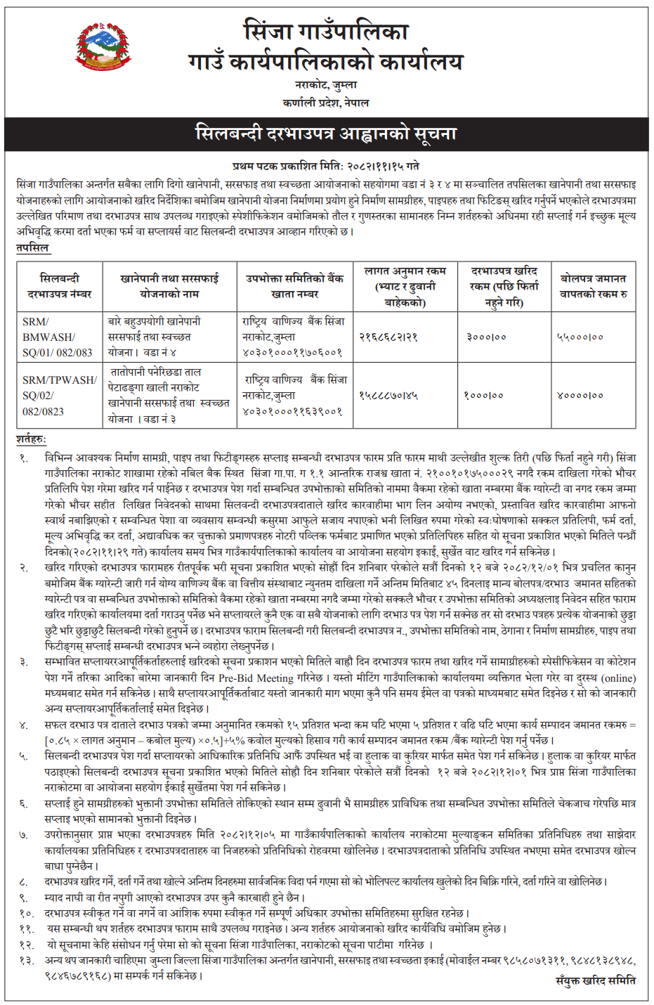 | 14 | Koshi and Bokraha river Management Project | Construction of CBDRM Shelter House-Bakraha River Basin | 04/03/2026 | PPMO | 05/04/2026 | Click Here | |