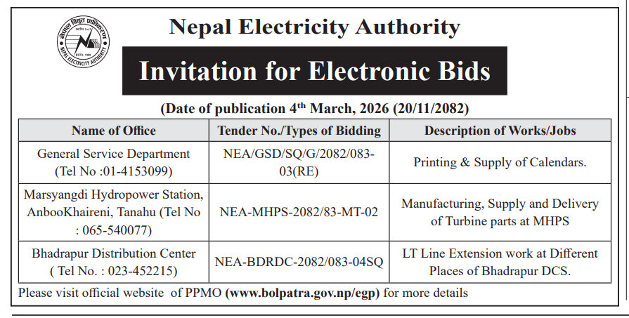 | 16 | NEA, Kulekhani Second Hydropower Station | Supply and Delivery of Mechanical Consumable Items at KL2 H.P.S | 03/03/2026 | PPMO | 02/04/2026 | Click Here | |