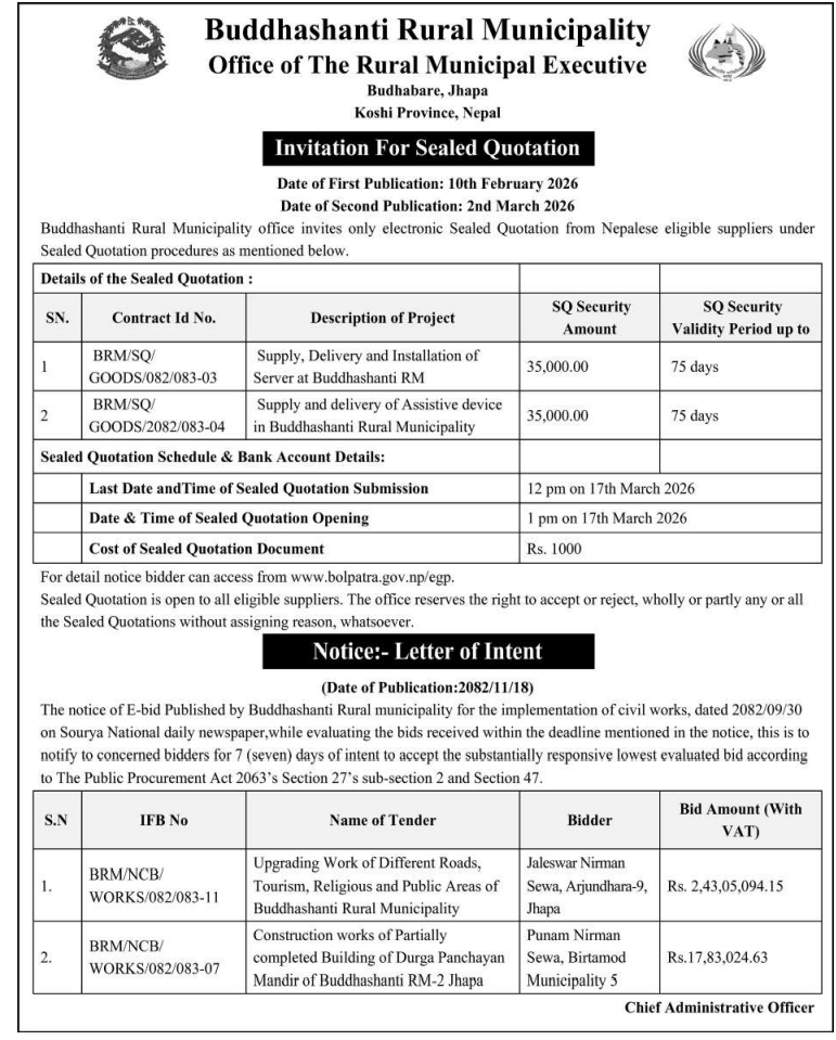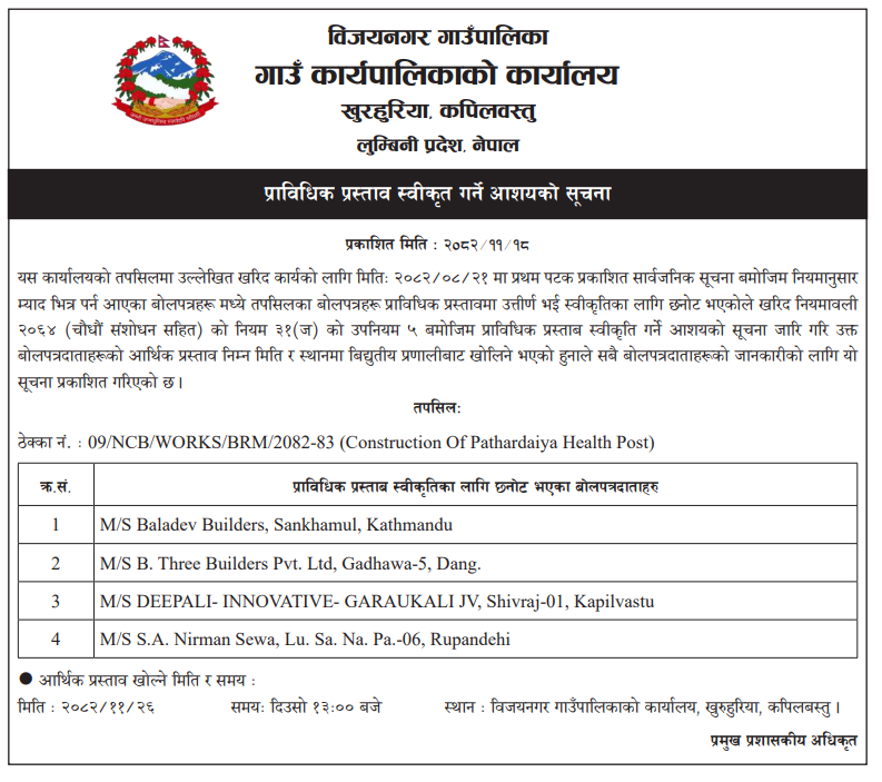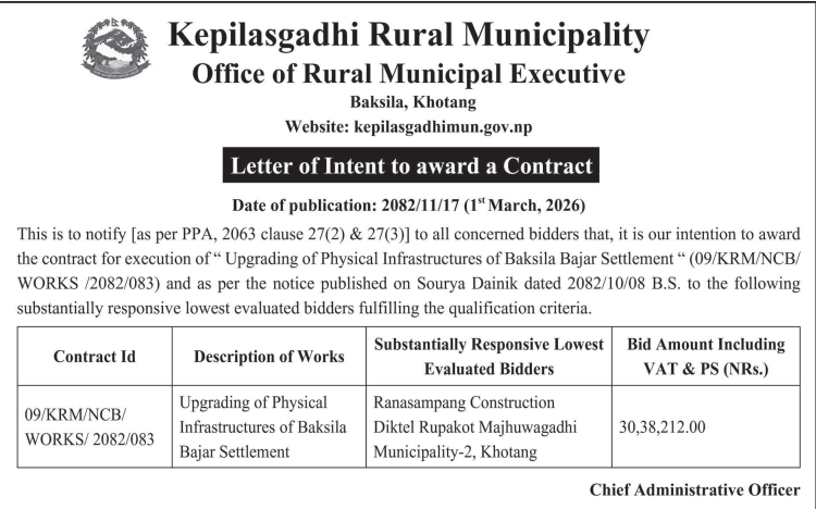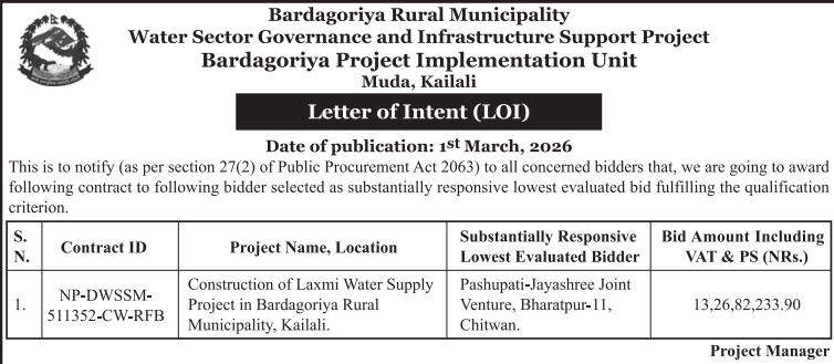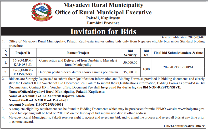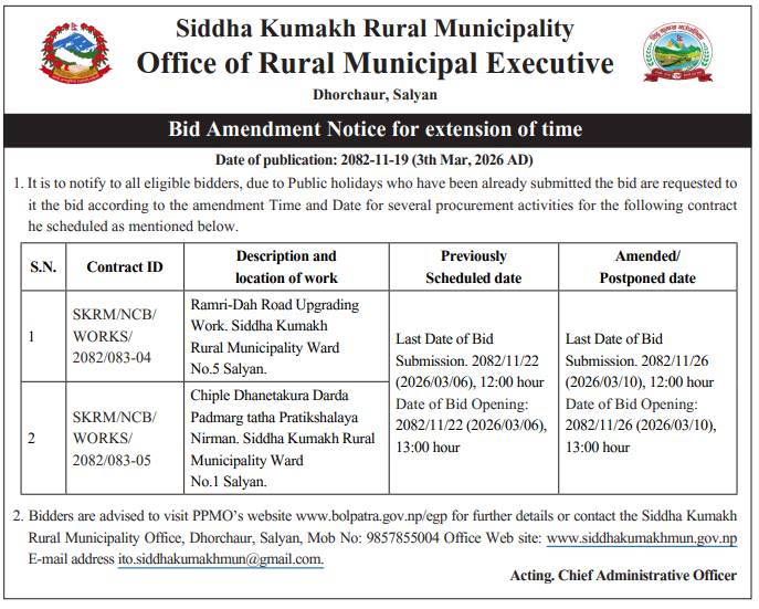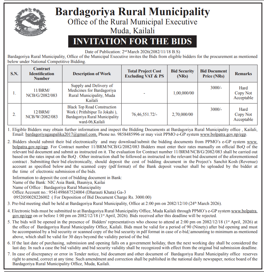 | 44 | Susta Rural Municipality | Supply and Delivery of Vehicle (Swari Sadhan) as per approved technical Specification at susta rural muncipality. | 03/03/2026 | PPMO | 02/04/2026 | Click Here | |