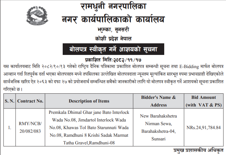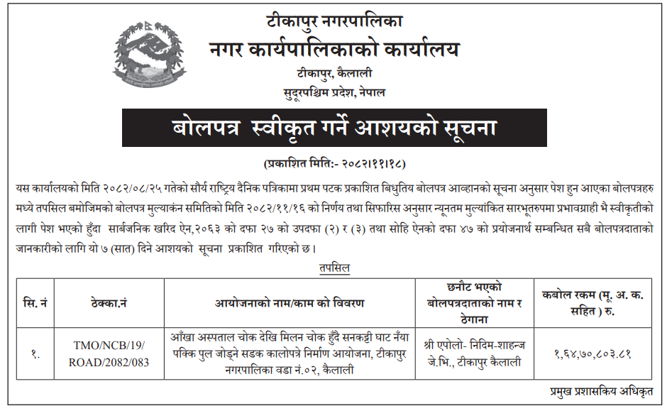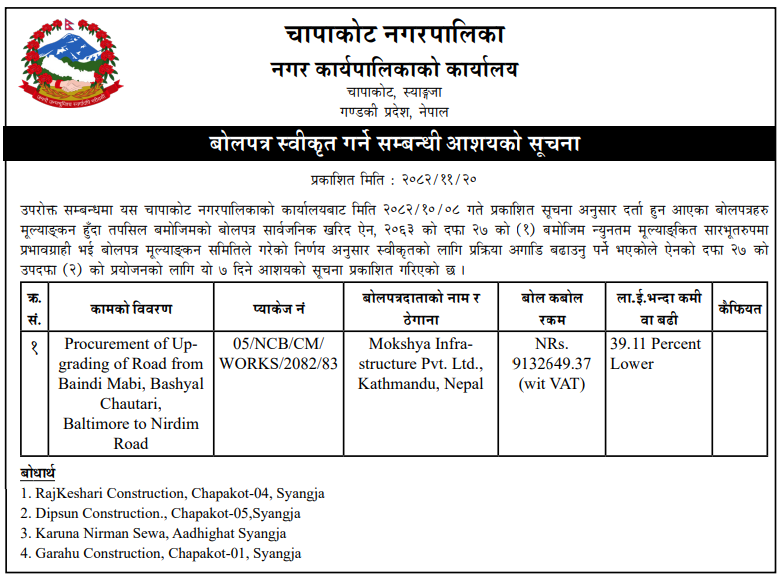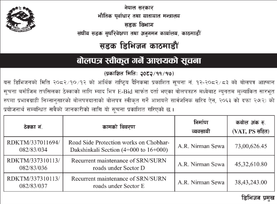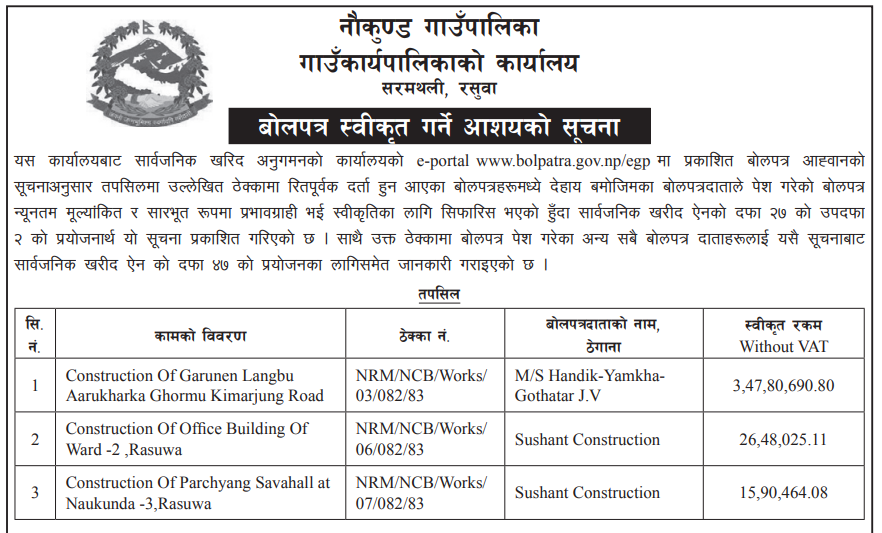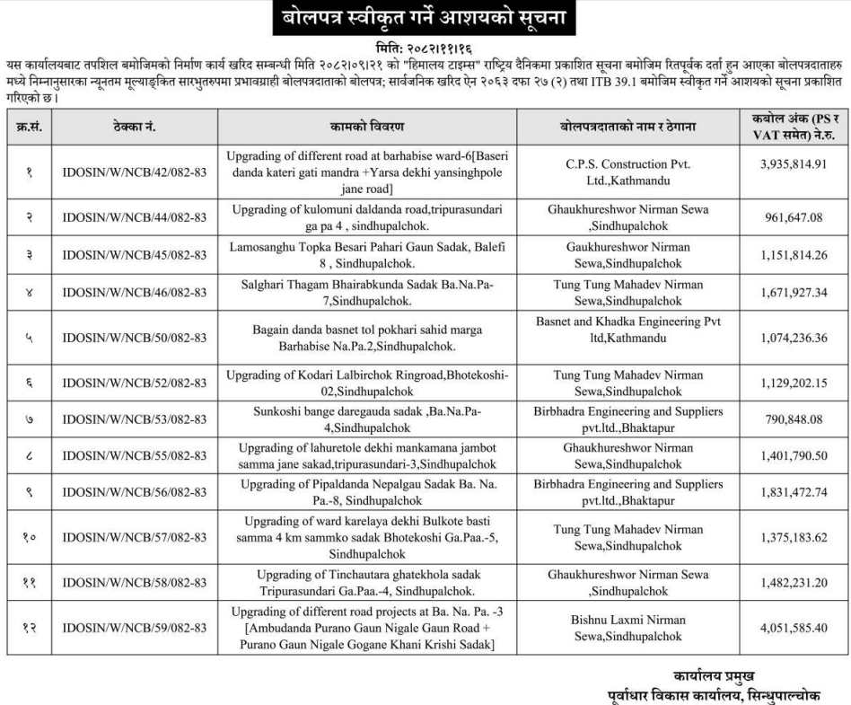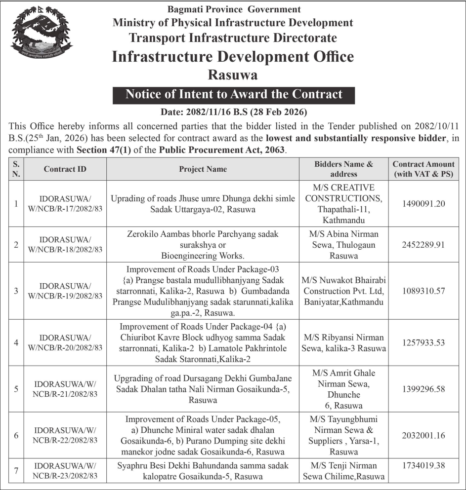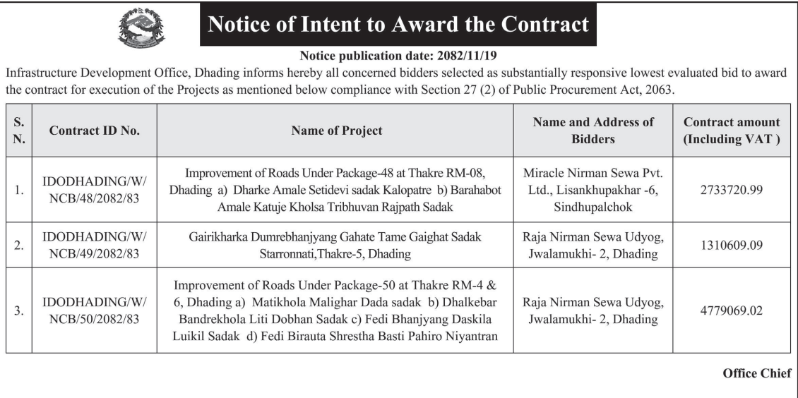 - Award Notice : Road Upgrading Work At Various Places (Swornikita Construction and Suppliers, Gatishil-Gravity JV) |
